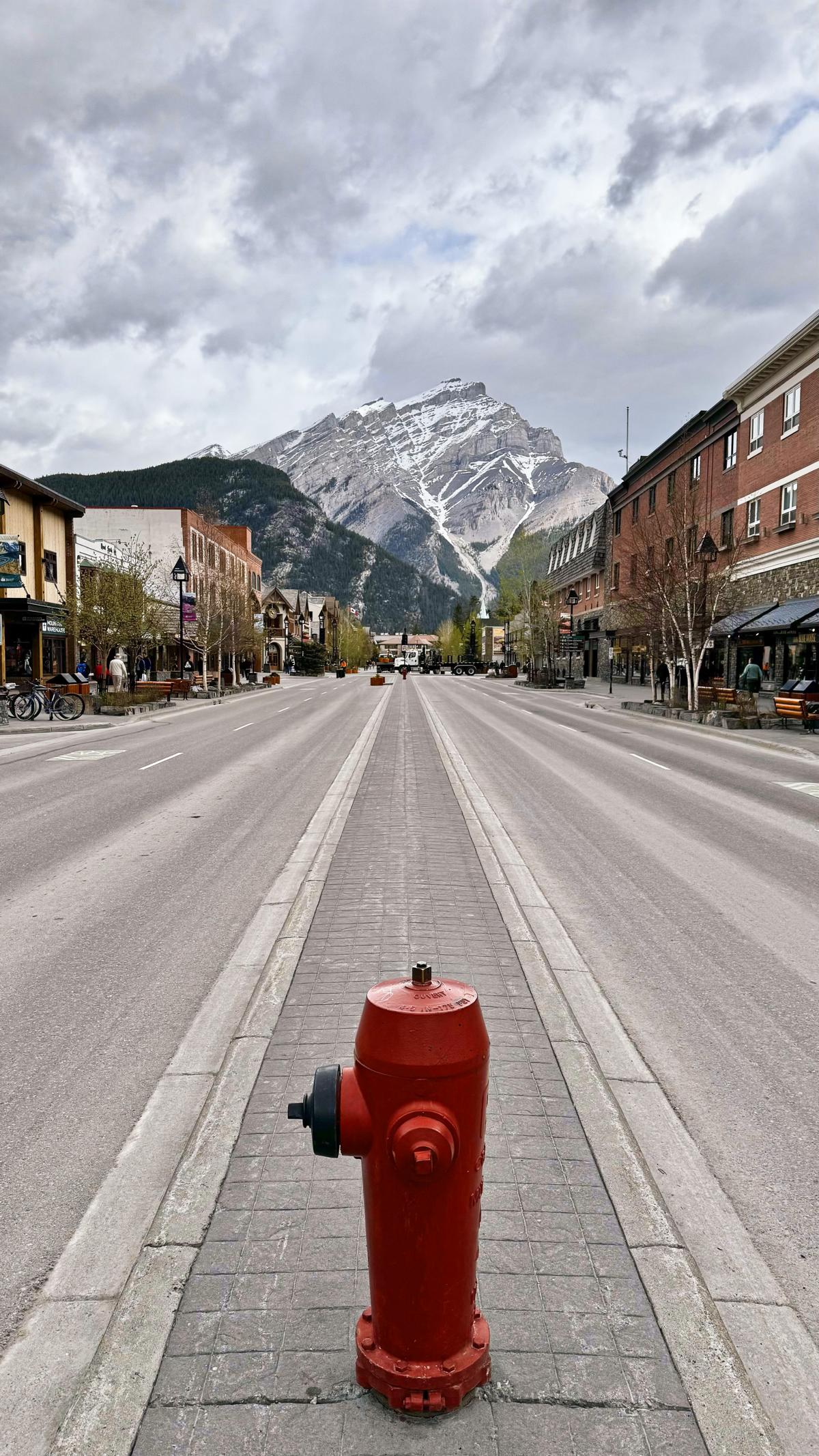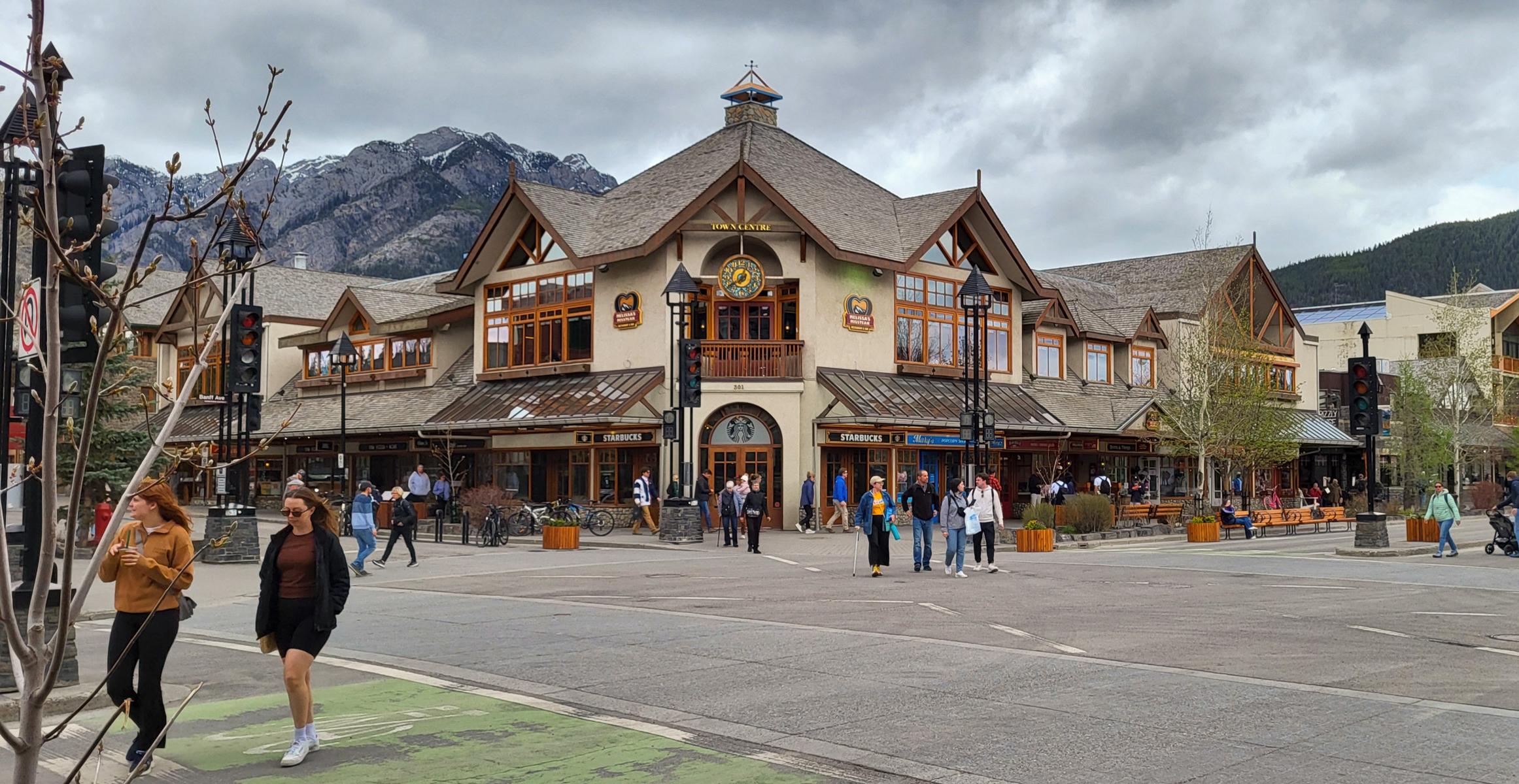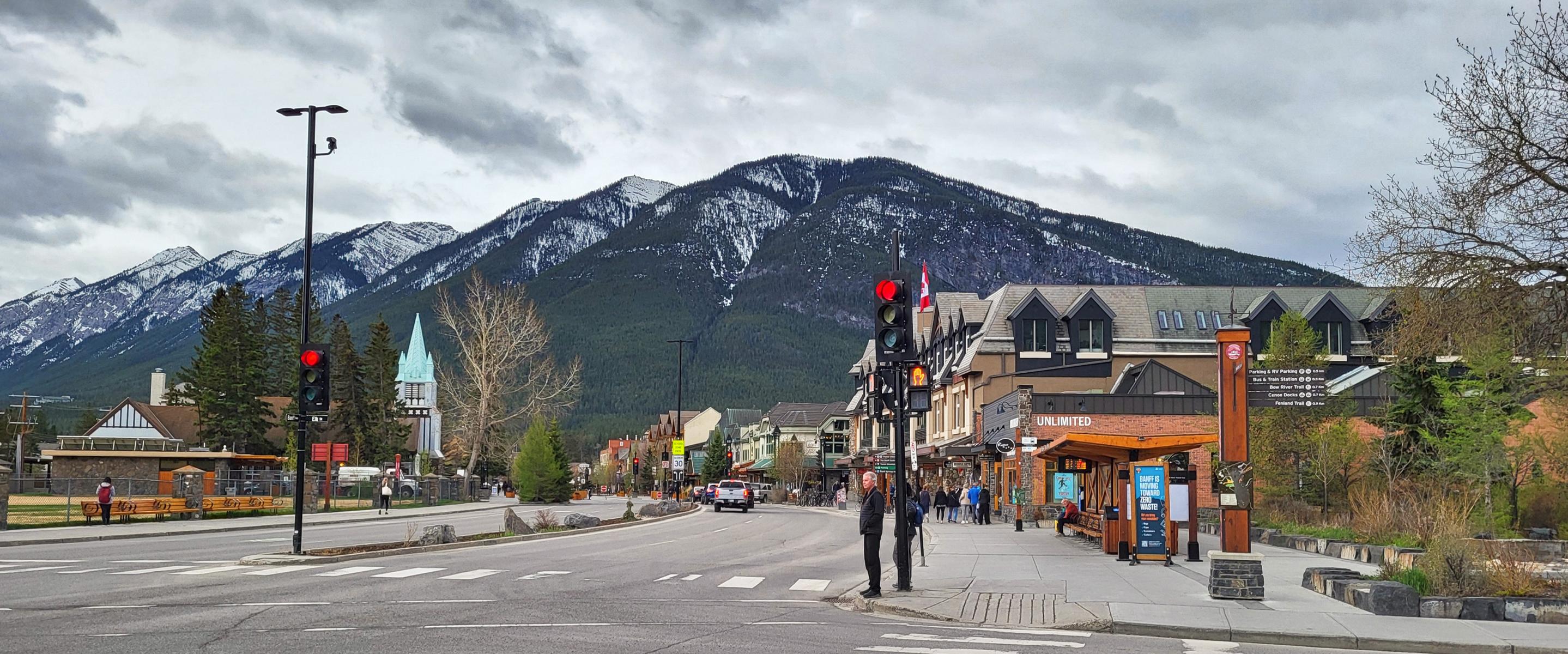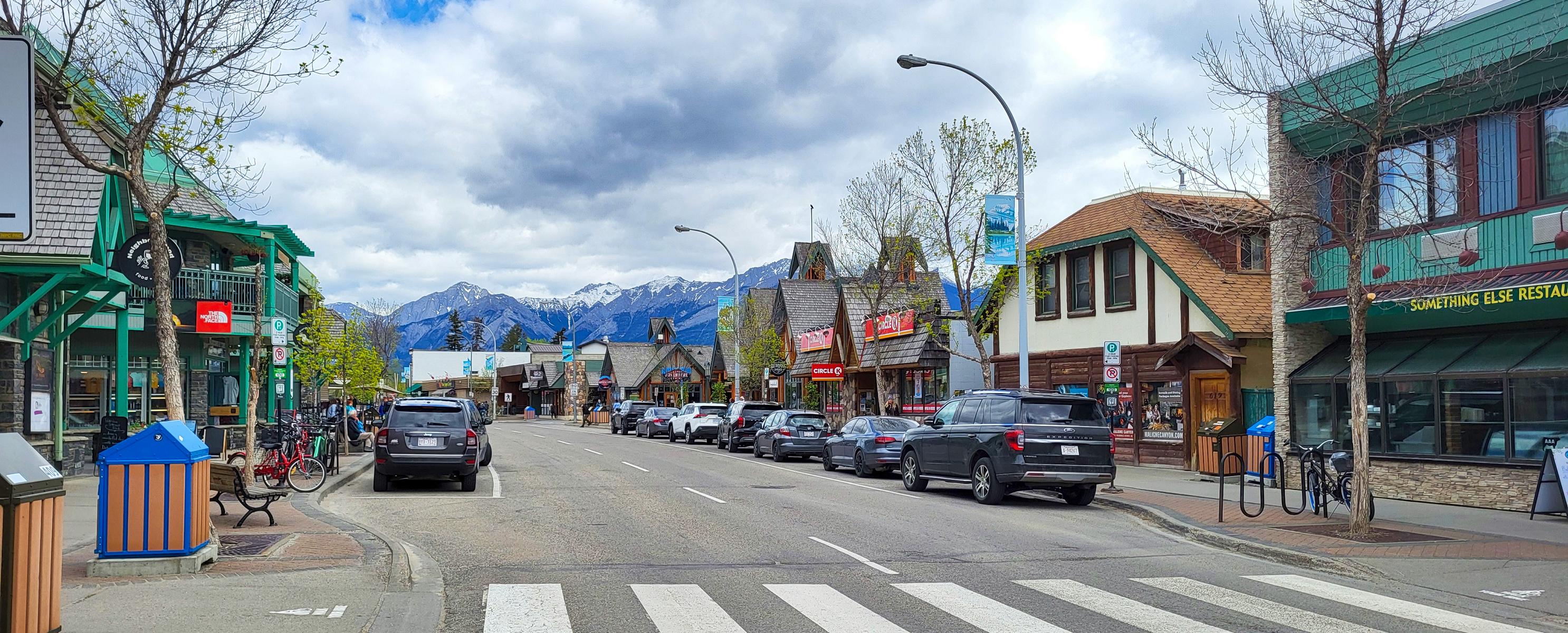 Der Begriff Stadt hat hier nicht zwingend die gleiche Bedeutung wie bei uns, trotzdem ist Banff hier eine bedeutende und flächenmäßig große Stadt. Die Hauptstraße ist von allen Seiten mit einem gigantischem Panorama ausgestattet. Die ganze Region lebt im Sommer wie auch im Winter vom Tourismus. Es wechseln sich Mountain Lodges mit dem Ski Resorts ab. Es gibt unzählige Ski, Fahrrad und Kanu / Kajak Verleiher. Outfitter, Touristenshops und natürlich Cafés und Restaurants säumen die Hauptstraße. Das alles wird nur übertroffen von dem absolut einmaligen Blick die Straße entlang.