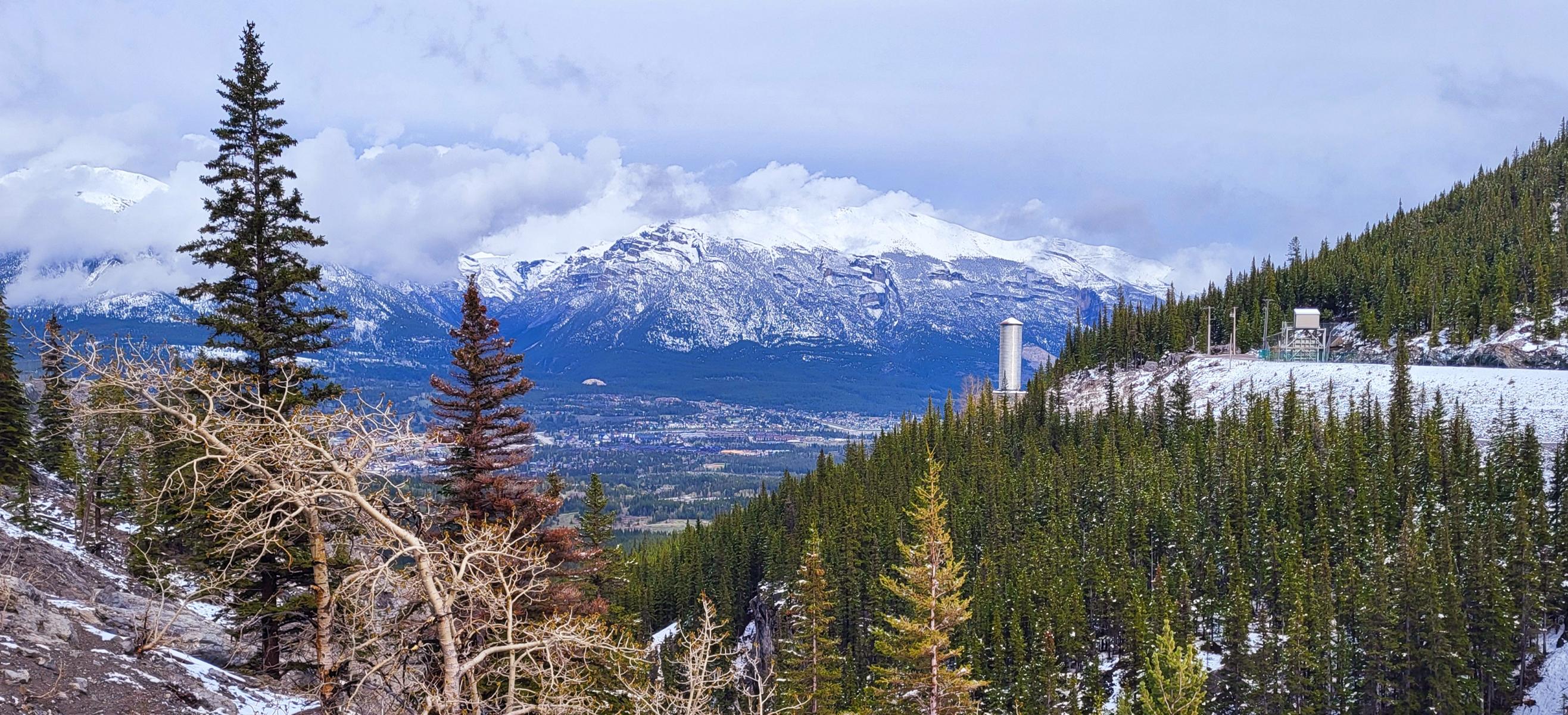 Abends hatten wir dann noch ein bisschen blauen Himmel und einen schönen Blick auf Canmore runter. Wie ihr am Auto sehen könnt, sind die Straßen nicht asphaltiert und schööööön matschig. Das Auto war nun wieder dreckig.