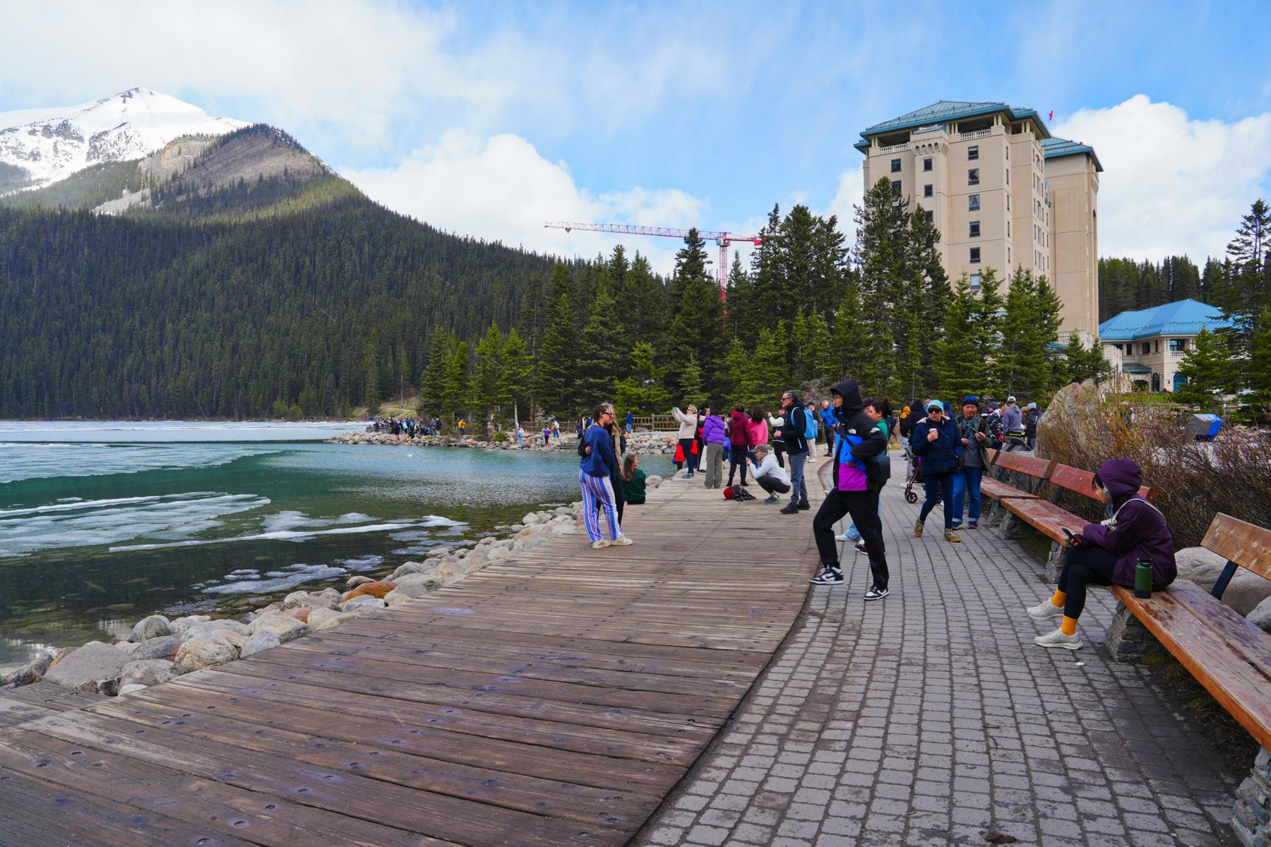 Vom Ort Lake Luise sind es ca. 5 Km Fußweg bis zum See selbst. Natürlich kann man auch mit dem Auto hinfahren, aber schon jetzt in der Vorsaison waren alle Parkplätze um 11 Uhr belegt und es kostet 38 Dollar für den Tag.