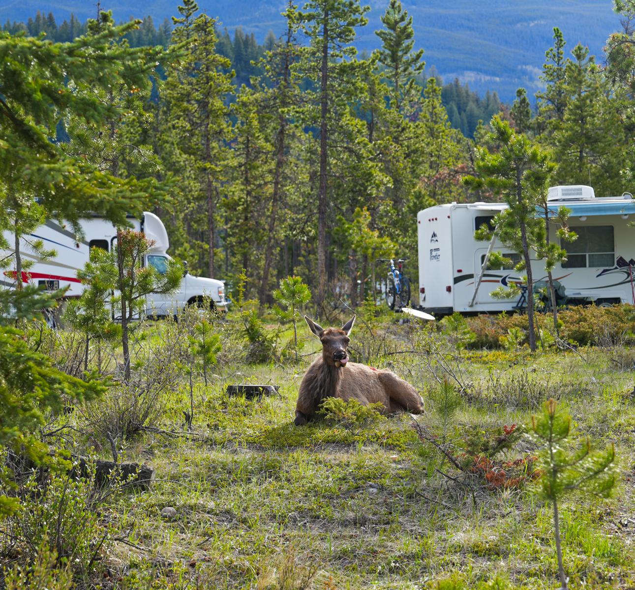 Kurz vor Jasper haben wir unser Lager auf dem Wapiti Campground aufgeschlagen. Er liegt sehr schön – direkt am Athabasca River. Man kann mit dem Auto nach Jasper rein oder aber mit dem Bus. Der Platz hat auch feste Bewohner, die wir „Mieter“ nicht stören dürfen. Die Dame hat, wie Ihr in der Nahaufnahme seht, einen roten Farbklecks im Fell. Das bedeutet, dass sie schon den einen oder anderen Camper, der ihr zu nahe getreten ist, über den Platz gescheucht hat.