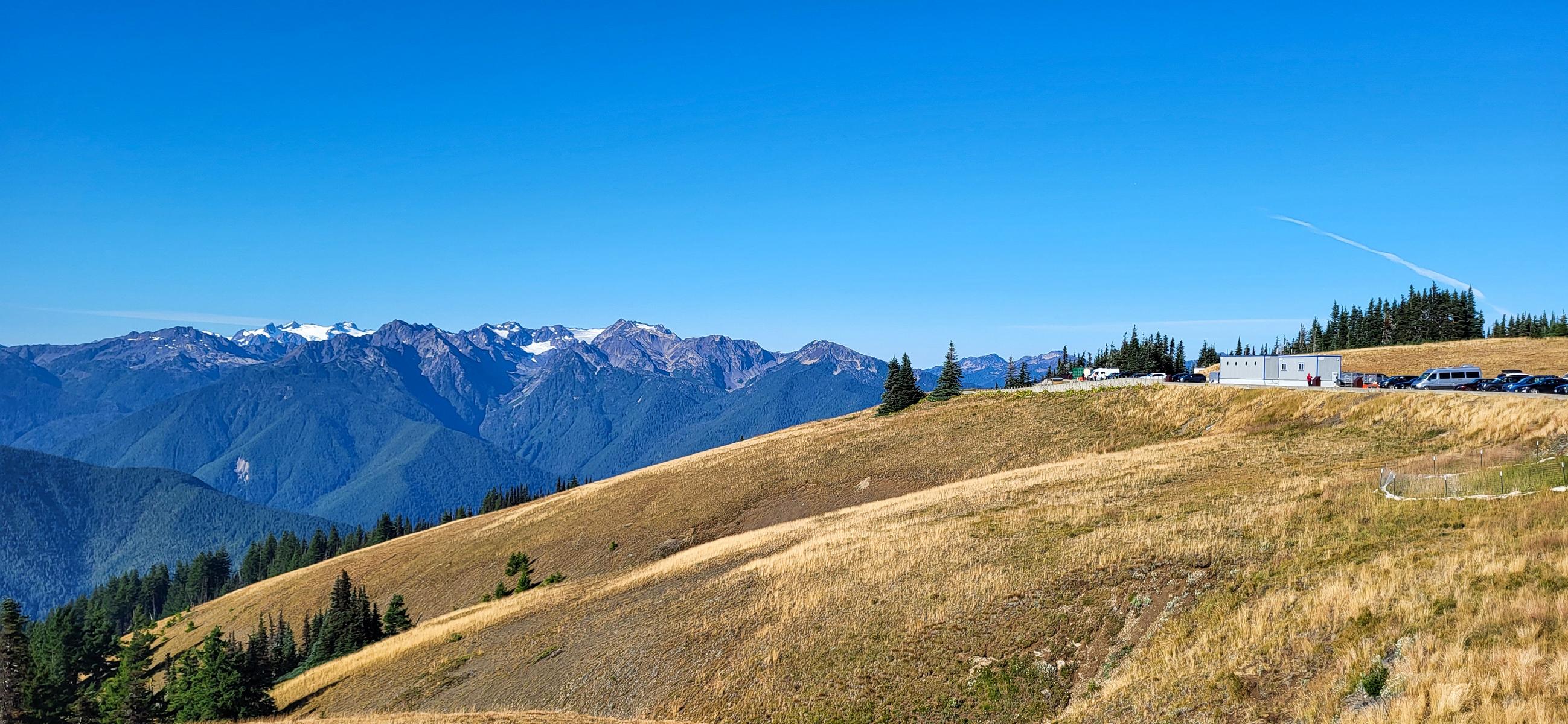 Da ich massiv mit einem Hexenschuss zu kämpfen hatte, sind wir keine steilen und langen Trails gelaufen, sondern haben mehr oder weniger die „Rentner-Touren“ gemacht. Der erste Stopp war „Hurricane Ridge“. Übernachtet hatten wir auf einem Campingplatz im Park, der erstaunlich leer war. Die Ridge ist eine alpine Bergregion mit einer wunderbaren Weitsicht. Wieder waren wir früh dran und hatten kein Problem, einen Parkplatz zu finden. Sogar eine Rehmutter mit zwei Jungen war so früh noch unterwegs.