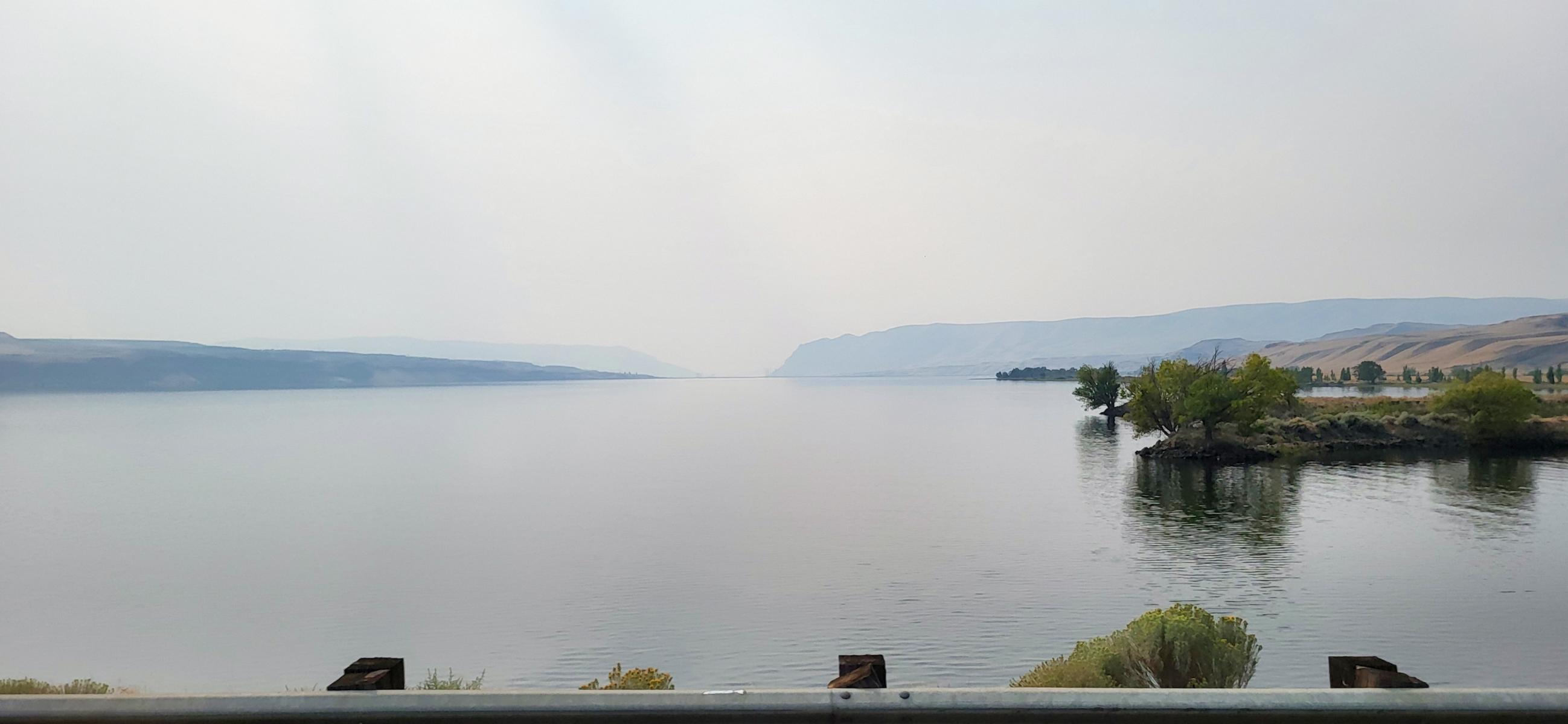 Schon als wir von Mt. Rainier wegfuhren, haben wir bemerkt, dass der Himmel immer dunstiger wurde, obwohl kein Regen oder Nebel in Aussicht war. In Montana angekommen, war der Himmel nur noch grau. Es war richtig warm, trotzdem konnten wir die Fenster nicht auflassen, weil alles nach Rauch roch. Beim Überqueren des Columbia River auf dem Weg nach Spokane wurde es so richtig deutlich. Mehrere kleinere Waldbrände in der Umgebung und vor allem der riesige Brand in Kalifornien haben den Himmel mit Rauchschwaden vernebelt. Auf einem kostenlosen BLM-Platz in der Nähe von Spokane haben wir über Nacht gestanden. Meine Bronchien waren von der trockenen und rauchigen Luft nicht besonders angetan. Dabei setzt dann einfach das Kopfkarussell ein. Der Gedanke, dass es keinen Ausweg gibt, egal wie lange und wohin man fährt: Man kommt nicht aus den Rauchschwaden raus. Mit Asthma kann man sich nur noch zu Hause mit der Klimaanlage einschließen. Fürchterliche Vorstellung.