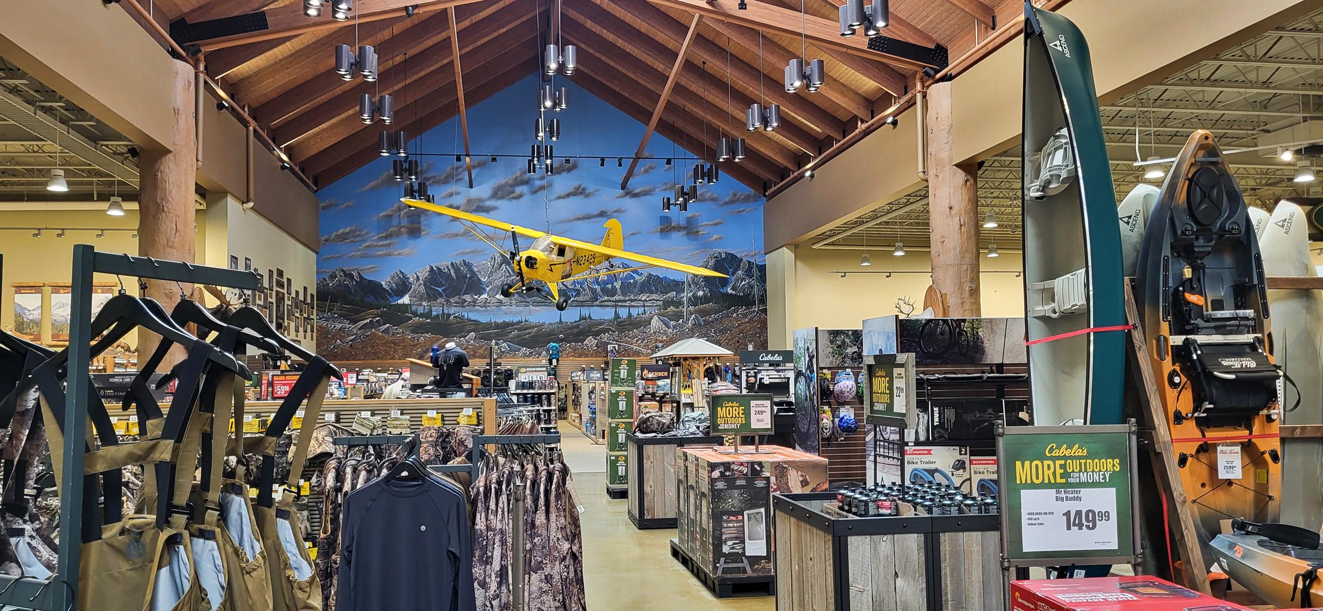 Ein weiteres Geschäft, das ich euch gerne zeigen möchte, ist Cabela’s. Es ist ein Outdoor-Ausrüster und Ausstatter, wie ich ihn noch nie gesehen habe. Selbst für amerikanische Verhältnisse sind die Verkaufsräume der Kette großzügig bemessen und liebevoll dekoriert. Es gibt alles, von Arbeitskleidung über Jagd, Fischerei, Wandern, Boote, Fliegen, Gewehre und Handwaffen (inklusive eines Seminars, das zum verdeckten Tragen einer Pistole berechtigt – richtig gruselig!). Natürlich gibt es auch Essen, Home Decoration, Kerzen und im September schon die erste Weihnachtsdeko für die Jagdhütte. Hier in Montana war für das Cabela’s-Management die Wahl in den USA ein Thema, und die Außendekoration war entsprechend enthusiastisch, aber ohne Namen (allerdings auch ohne Zweifel). Ansonsten schaut euch die Bilder an. Es ist ein Mix aus Verkauf und Ausstellung. Das Bemerkenswerteste: Die Preise sind absolut in Ordnung und günstiger als in anderen Outdoorläden.