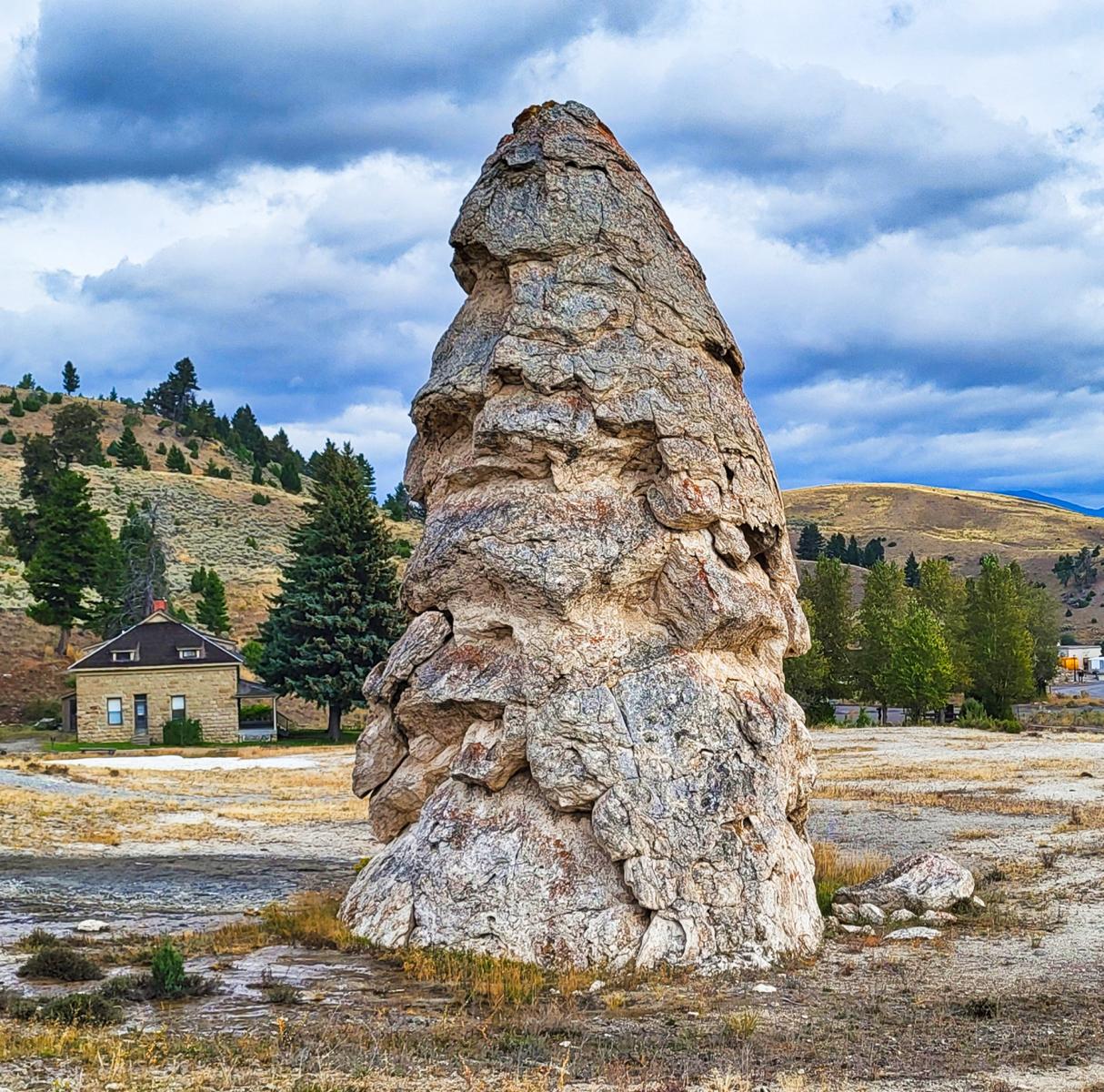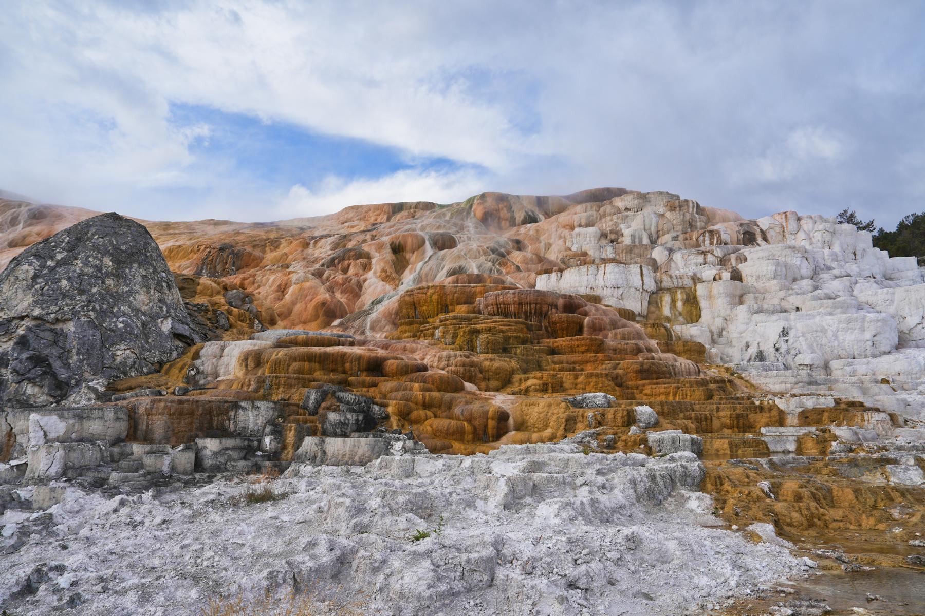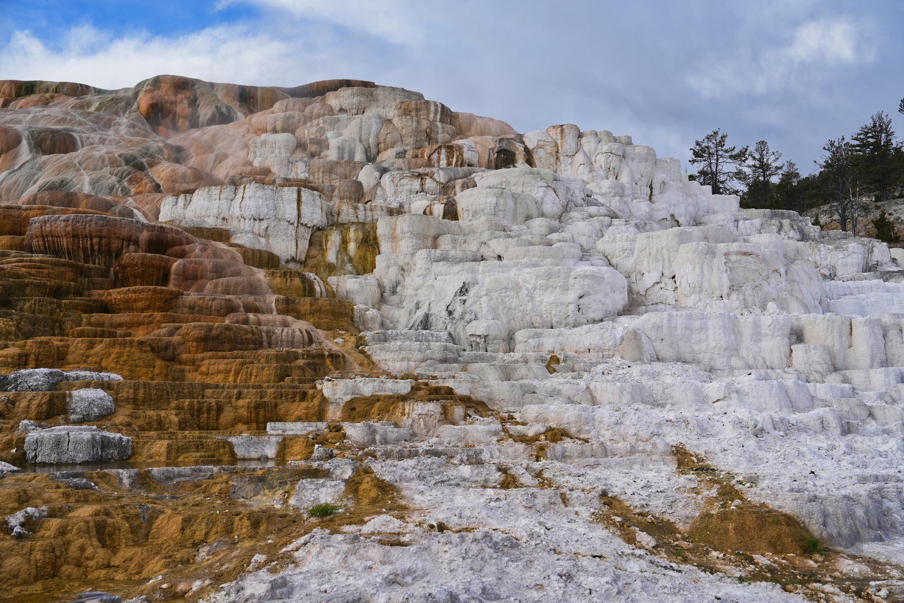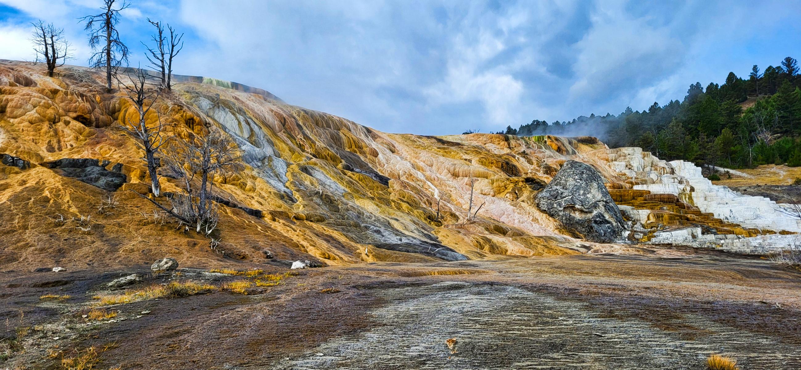 Am nächsten Morgen ging es dann früh los. Das Wetter war leider nicht so toll wie am Tag zuvor. Vom Nordeingang kommt man zuerst zu den „Mammoth Hot Springs“. Das ist auch ein kleiner Ort mit vielen Hotels und Gästezimmern. Das heiße Wasser läuft einfach über die Hügel nach unten, und die enthaltenen Mineralien machen aus dem blanken Felsen eine wunderbar farbige Landschaft.