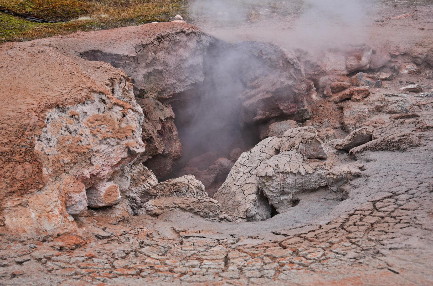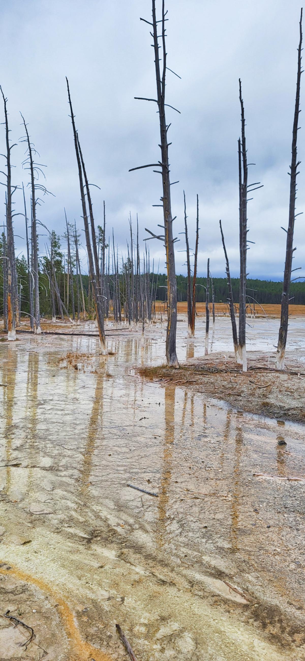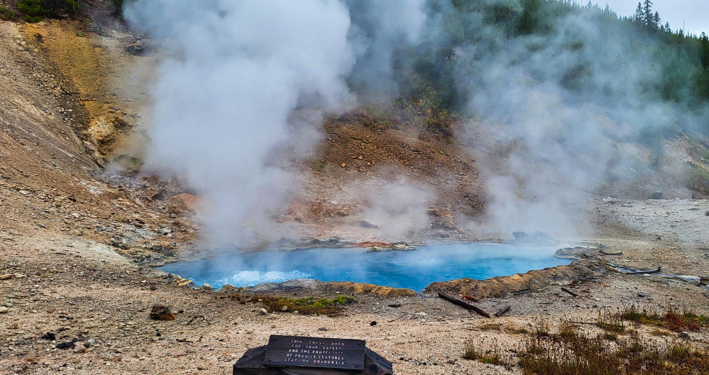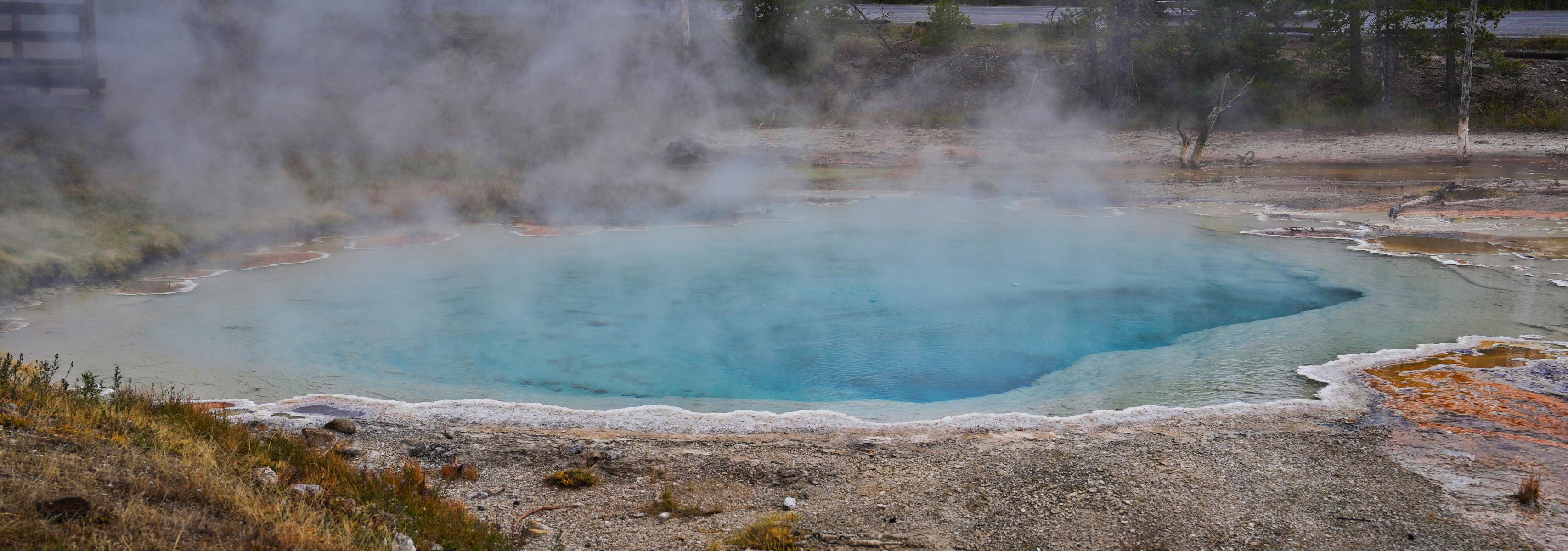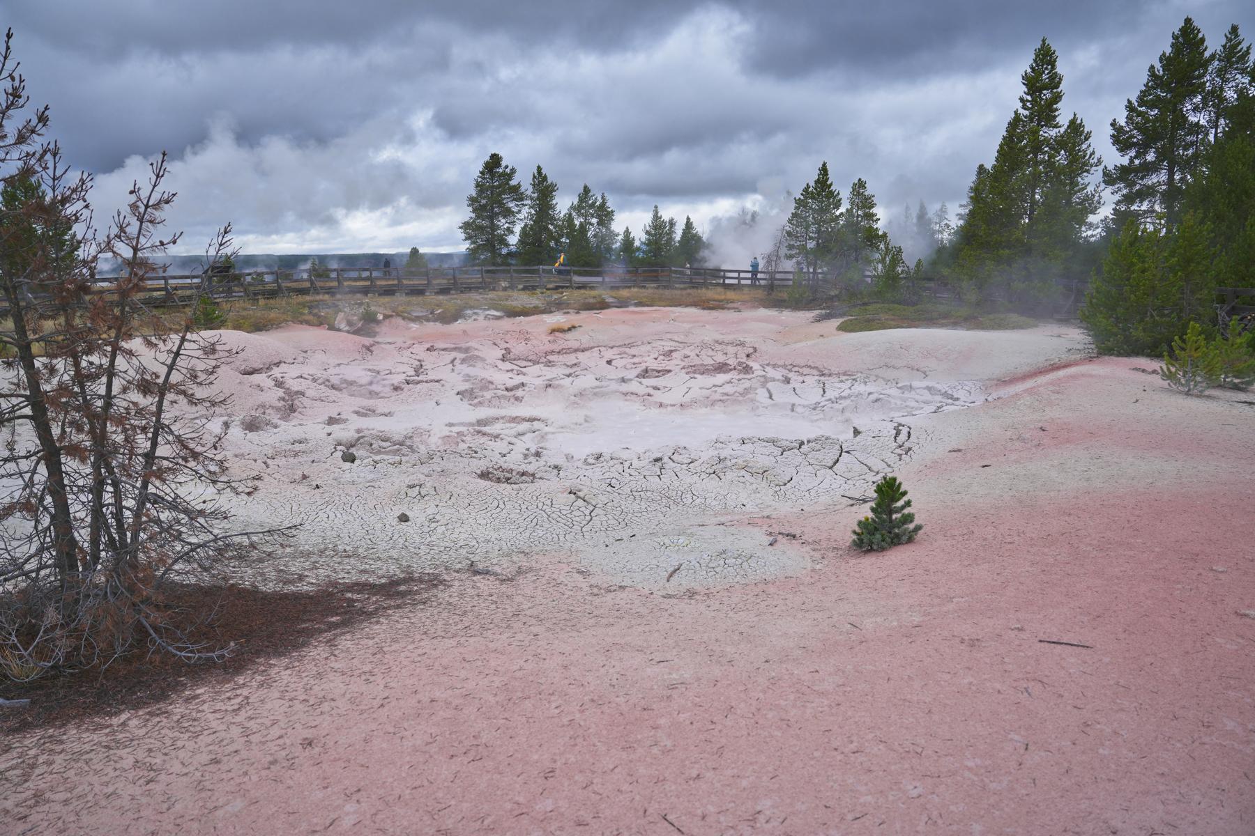 Weiter durch den Park, den „Grand Loop“ entlang, kommt man an den vielen heißen Quellen und Schlammpfützen vorbei. Selbst an ganz normalen Bächen steigt immer wieder Dampf auf und zeigt an, wo überall heißes Wasser aus dem Boden kommt. Die größeren Quellen sind gut über feste Holzwege zu erreichen. Da das Wetter nicht so gut war, hielten sich die Menschenmassen in Grenzen, und wir hatten kein Gedrängel.