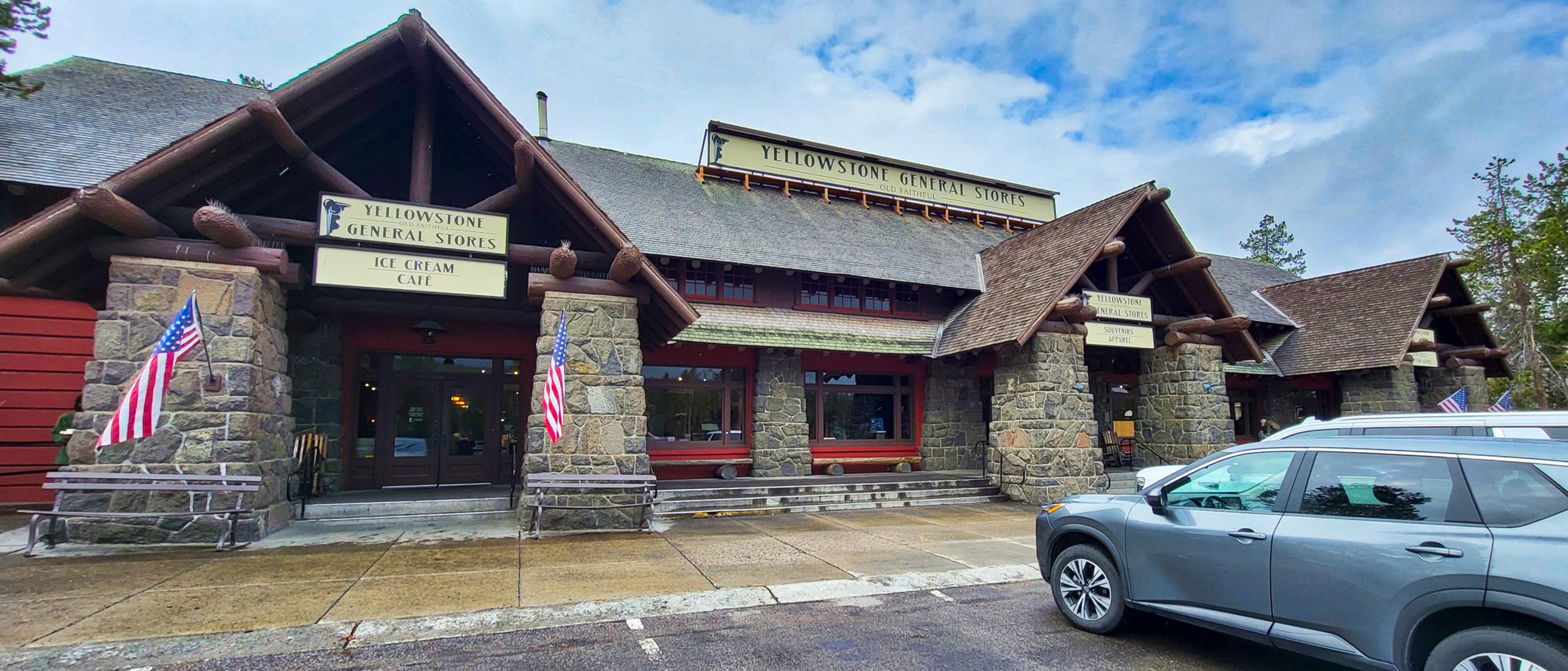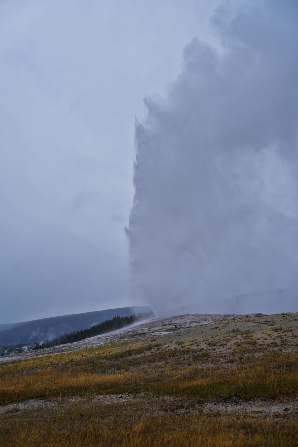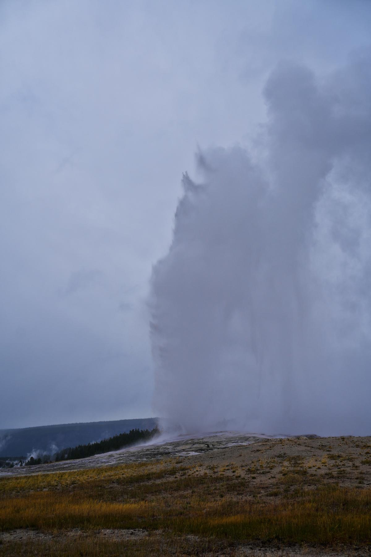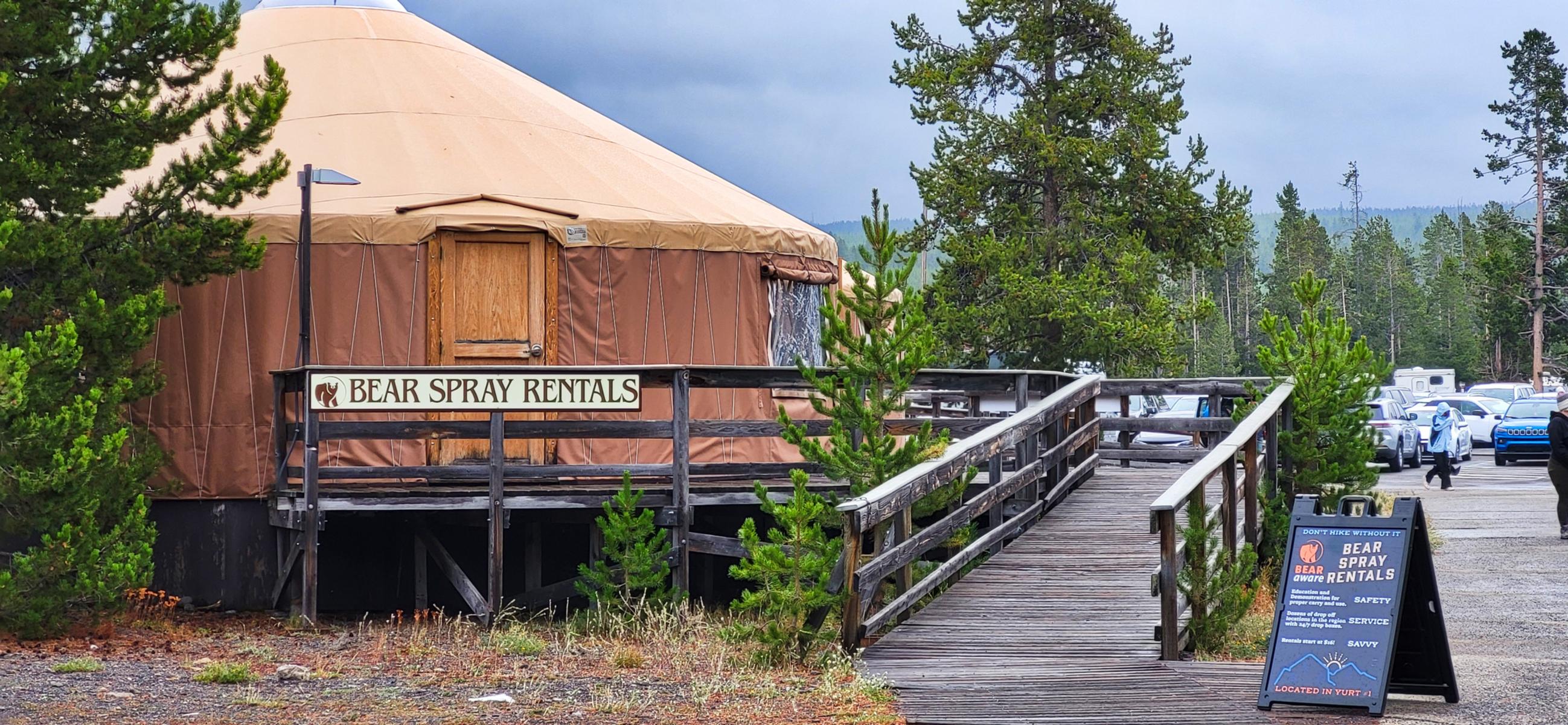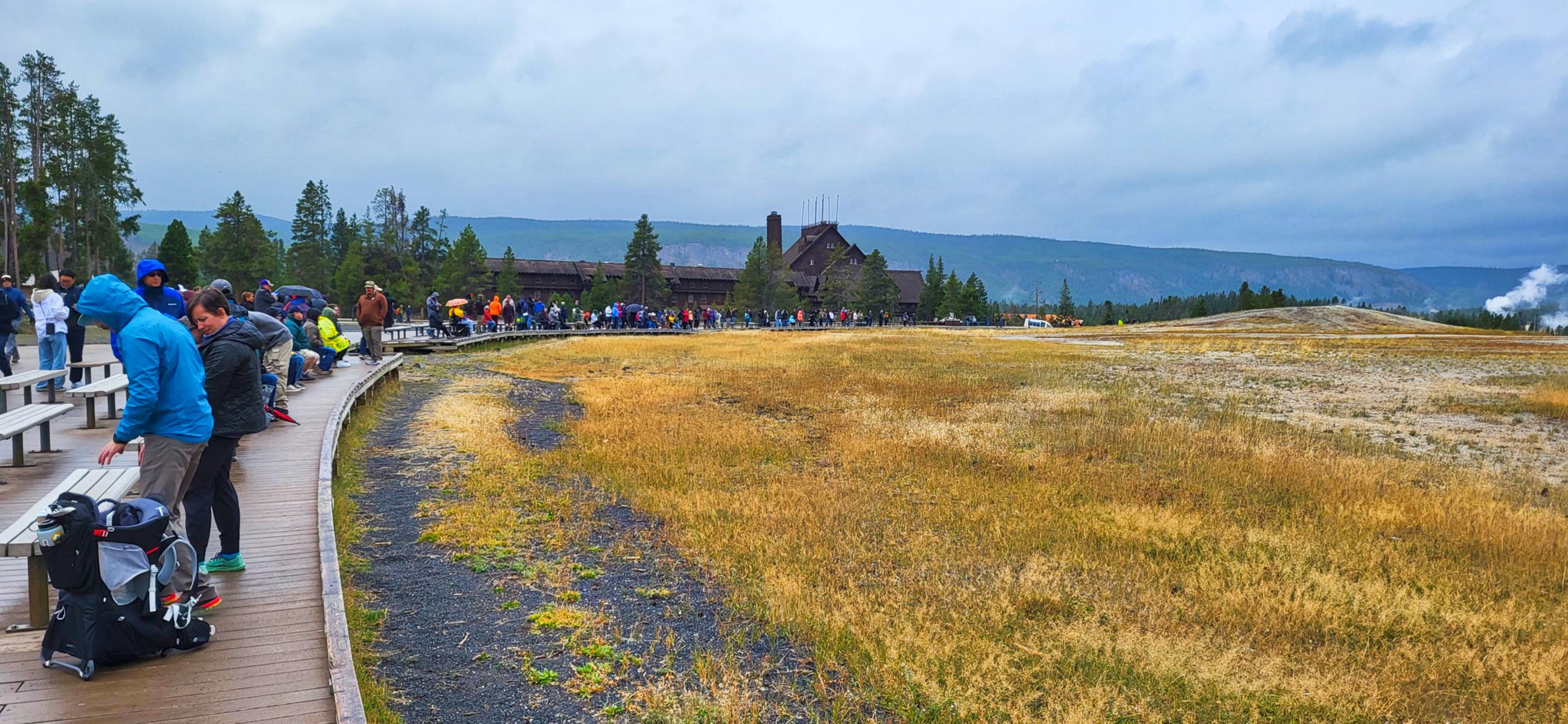 Last but not least, der „verlässliche“ „Old Faithful“. Um den Geysir herum gibt es einen riesigen Parkplatz, mehrere große Lodges mit offenem Kamin und gemütlichen Sofas in der Lounge sowie größere Andenkenläden mit „originaler“ Kunst (Made in Taiwan) und generischen Weihnachtskugeln, die nach Plastik schreien. Es ist natürlich total gefährlich, in dieser Gegend über einen Parkplatz zum Geysir zu laufen. Man bedenke, man ist in „Bear Country“. Gott sei Dank gibt es die „fake“ Tippis, in denen man sich ein Bärenspray für den gefährlichen Weg ausleihen kann. (Nicht falsch verstehen: Auf einer längeren Wanderung ist ein Bärenspray absolut gerechtfertigt. Mittlerweile wird von offizieller Seite gesagt, lautes Sprechen sei besser als die Glöckchen. Wahrscheinlich sind die Bären mittlerweile wie die Pawlowschen Hunde konditioniert. Wenn das Glöckchen läutet, gibt es Essen.)