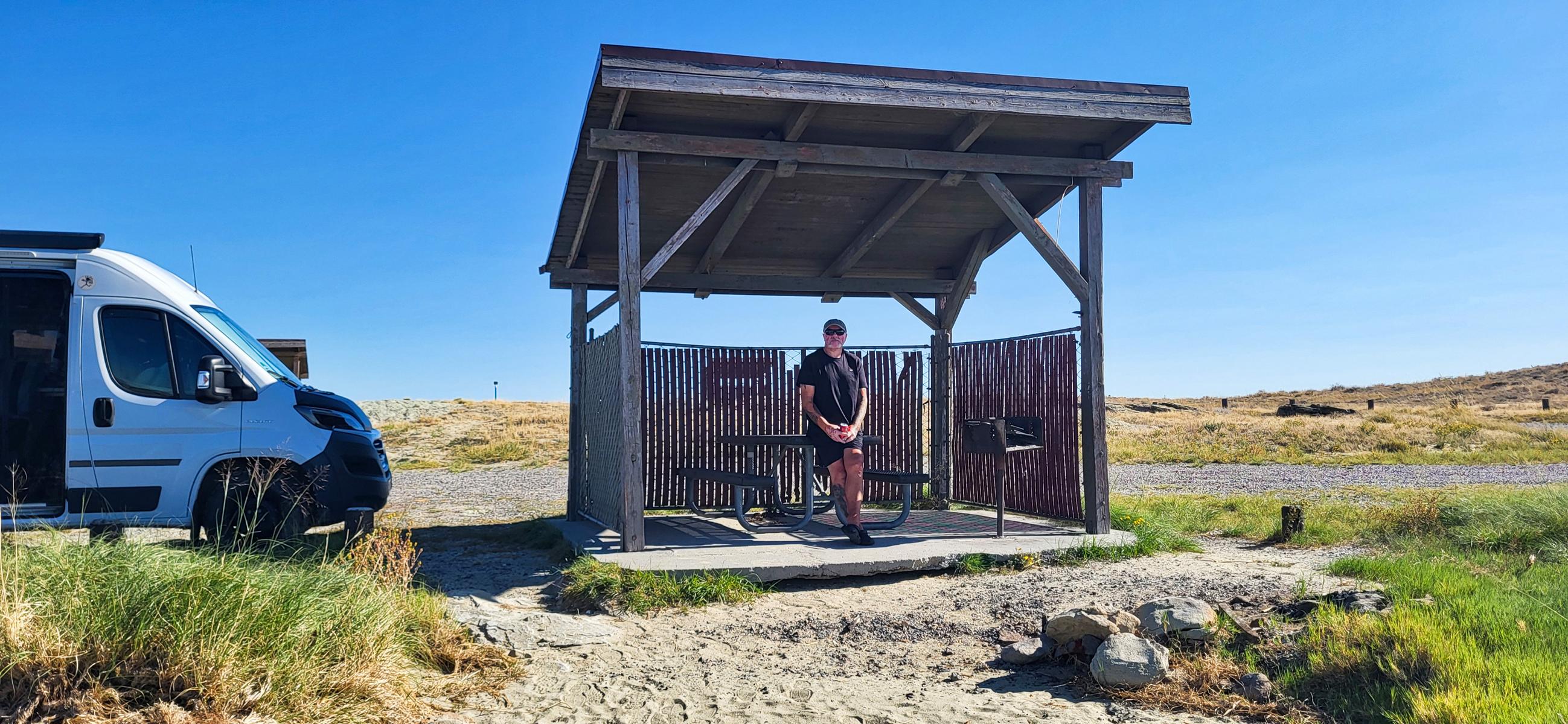 Weil die Gegend so trocken ist, gibt es nur Gras und maximal kniehohe Büsche, das war’s. Kein Baum, kein Strauch und schon gar keinen Schatten. Wir hatten uns die ganze Zeit schon gewundert, warum die Amerikaner mit Wohnwagen, Camper Van und 5th Wheel hier immer eine oder je nach Größe sogar zwei Klimaanlagen auf dem Dach herumfahren. Na ja, in Washington ist es nicht wirklich notwendig, aber hier im Mittleren Westen macht es einen Unterschied. Der Nachteil daran ist, dass sich die Klimaanlage nur schlecht über Solarstrom betreiben lässt. Also hat jeder Camper seinen Generator dabei. Das Gebrumme der Generatoren verfolgt uns nun seit Wyoming. Bisher sind wir es noch nicht wieder losgeworden. Denn wir, mit unserem typisch deutschen Van, haben zwar eine Klimaanlage beim Fahren, aber keine, wenn wir in der Sonne stehen. Also Jalousie raus, schwitzend im knappen Schatten sitzen und dem Generator des Nachbarn lauschen.