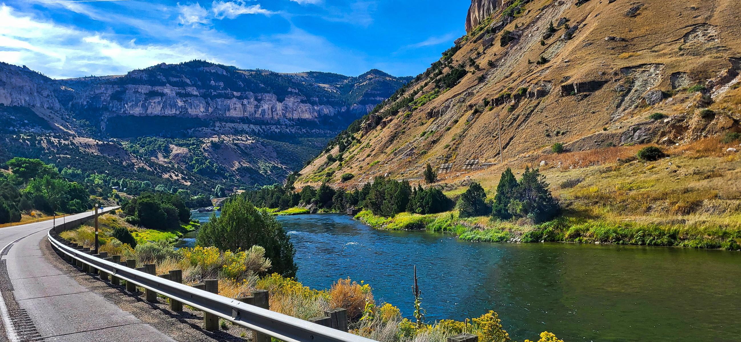 Durch Zufall haben wir auf der Karte das Städtchen Thermopolis in der Nähe entdeckt. Wegen des Namens wurde ich neugierig und habe es auf Google Maps gecheckt. Tatsächlich gibt es dort eine heiße Thermalquelle mit einem kleinen Badehaus, das für die Öffentlichkeit zugänglich ist und keinen Eintritt kostet (Spenden werden gerne angenommen). Da ich immer noch Ärger mit meinem Rücken hatte, habe ich Rainer davon überzeugt, dass wir auch bei 30 Grad den Umweg machen müssen. Die Fahrt dorthin war unerwartet schön. Plötzlich sind wir in einen Canyon gefahren, der sich entlang des Wind River gewunden hat. Auf einer Seite die Straße, auf der anderen Seite die Eisenbahn.