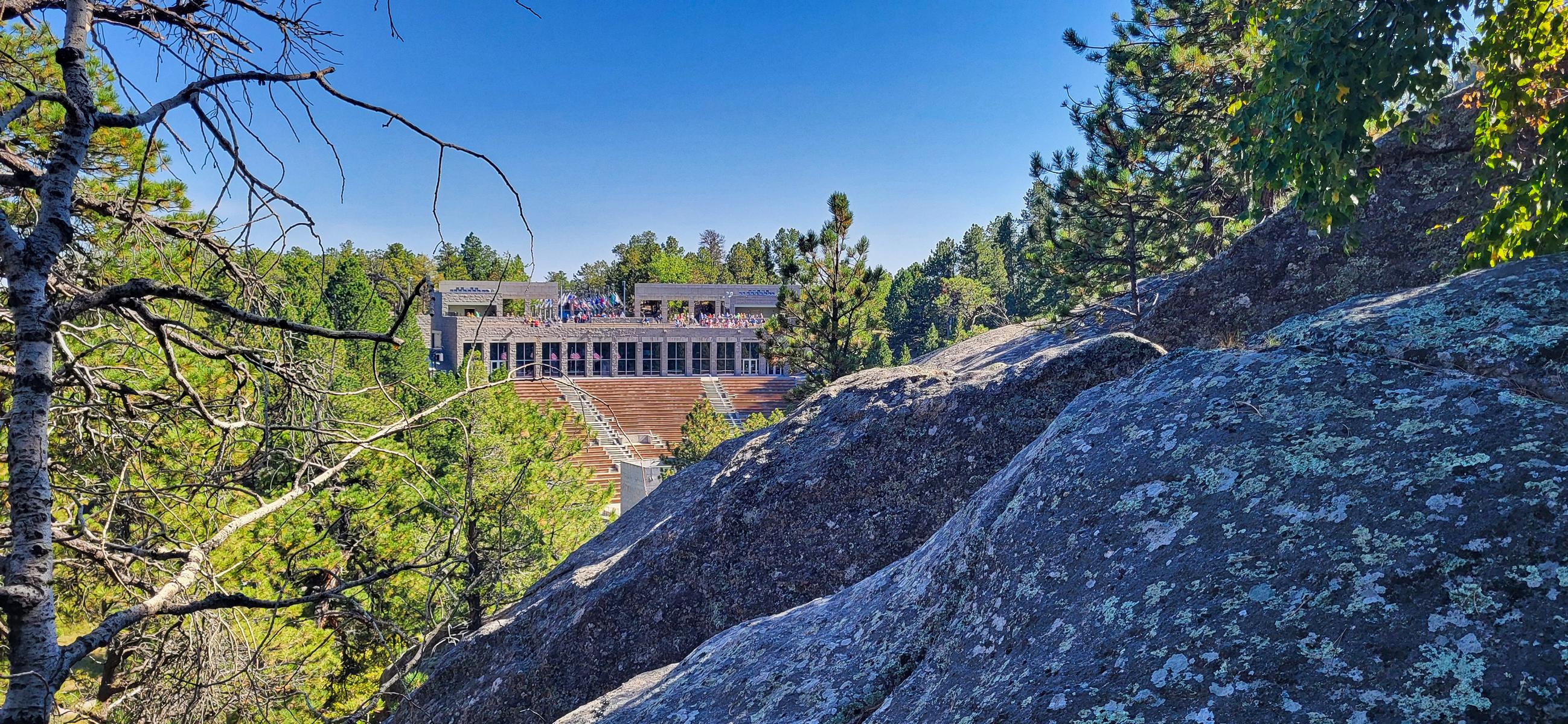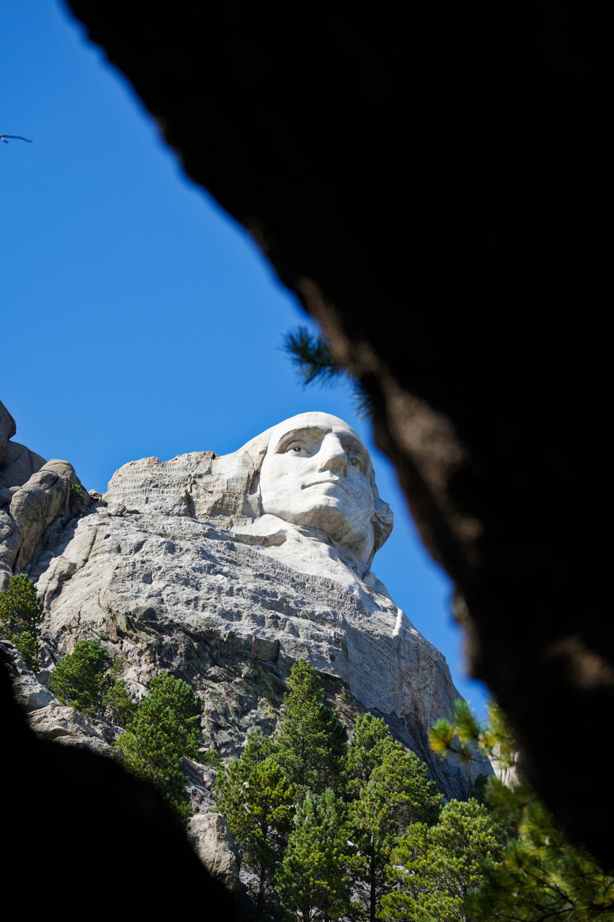 Natürlich ist der Zugang zur Besucherterrasse absolut barrierefrei. Wenn man es bis zum Parkplatz geschafft hat, kommt man auch rauf. Die Architektur ist gradlinig, zeigt aber sehr viel Größe und Erhabenheit. Mich erinnert es so ein bisschen an die Architektur des Tempelhofer Flughafens. So zeigt man den Besuchern, wer man ist. Bewertet es selbst. Vom Eingang des langen Gangs bis zur Terrasse ist alles mit Plaketten aller 51 Staaten und deren Beitrittsdaten geschmückt. Es führt ein Rundweg von der Terrasse zu den Felsen, aus denen die Köpfe gehauen sind. Der Weg geht weiter über die Werkstatt der Bildhauer (John Borglum und Lincoln Borglum) wieder zurück zur Terrasse. In der Werkstatt sieht man eines der ursprünglichen Modelle und bemerkt, dass die Ausarbeitung im Fels nicht so detailliert ist. Der nette Ranger erklärt gerne, dass man beim Behauen des Felsens eigentlich nur die weicheren Steinschichten erwartet hat, aber dann doch auf Granit gestoßen ist. Deshalb sind die Köpfe und Schultern auch nicht ausgeformt. Ohne Zweifel sind die Augen das Faszinierendste an den Köpfen. Die Pupillen sind Höhlen, in denen Steinstifte die Highlights in den Augen bilden. Aus der Entfernung sehen die Augen täuschend echt aus. Wenn man in die Bilder bei George Washington hineinzoomt, kann man es ganz gut sehen.