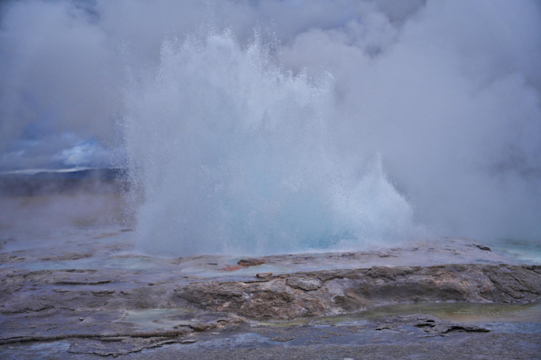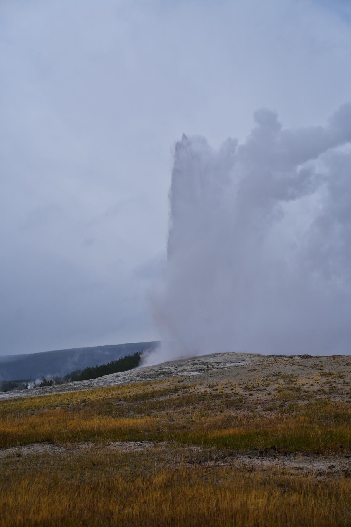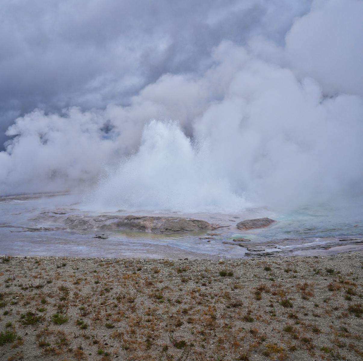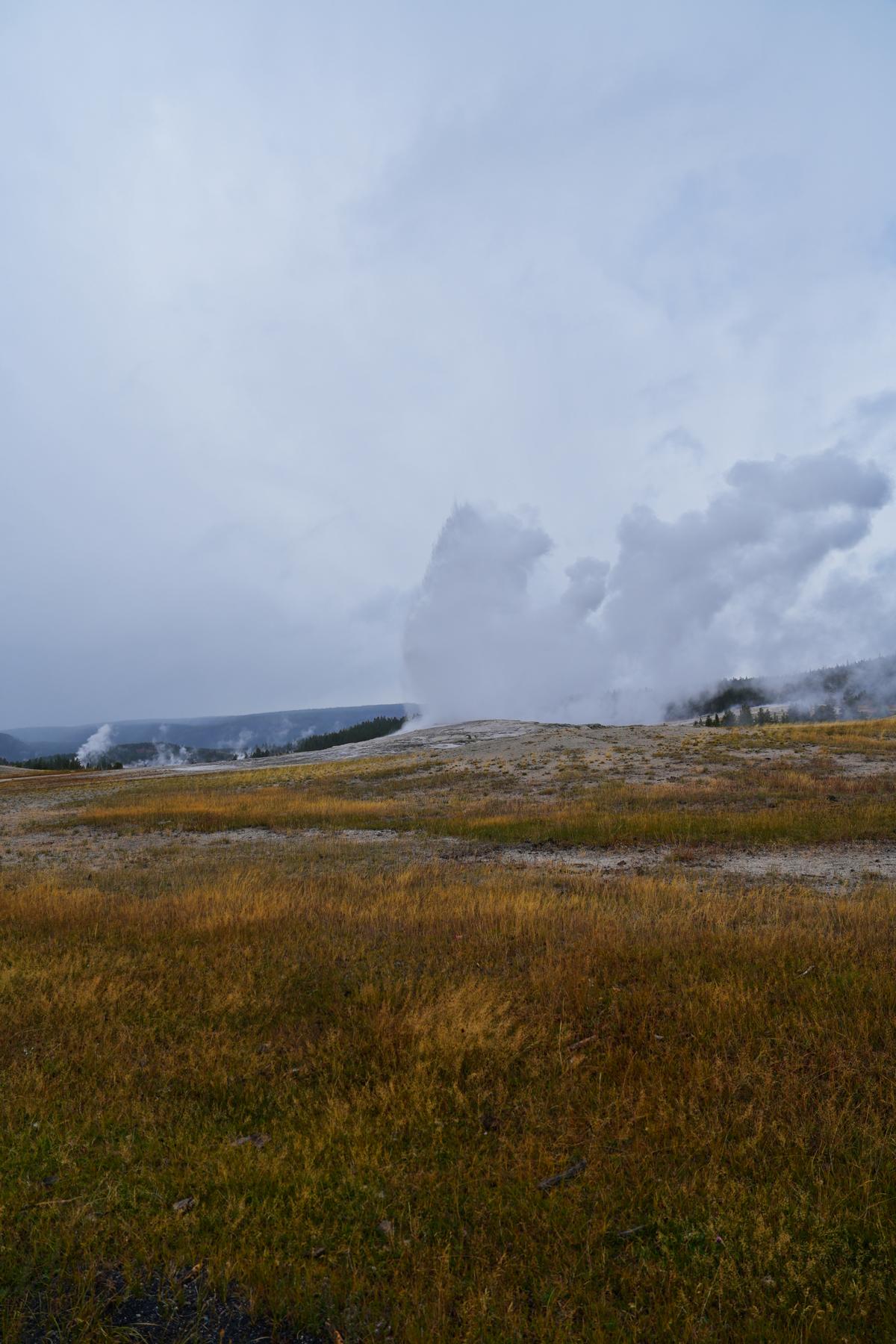 Hier auch wieder die Holzwege, die einen zu zwei Dritteln geschlossenen Kreis um den Geysir herum machen. Schaut euch die Fotos an; so sieht es an einem Tag aus, an dem es sehr wenige Besucher im Park gibt. Ihr könnt euch vorstellen, was los ist, wenn die Ferienzeit und Hauptreisezeit in den USA ist. Und ja, um allen Fragen vorzugreifen: Ich würde jederzeit wieder den Yellowstone Park besuchen, egal wie viele andere noch da sind!