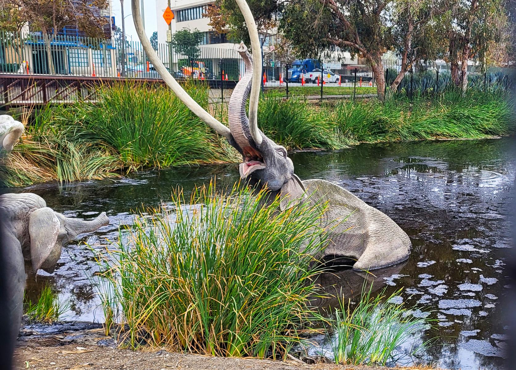 Es gibt bestimmt noch andere Orte, aber das ist der einzige inmitten einer riesigen Großstadt, an dem das Erdöl so nah an der Erdoberfläche ist, dass es herausblubbert. Rundherum gibt es einen kleinen Park mit einem kleinen, aber feinen Museum zu den Funden aus den Teergruben.