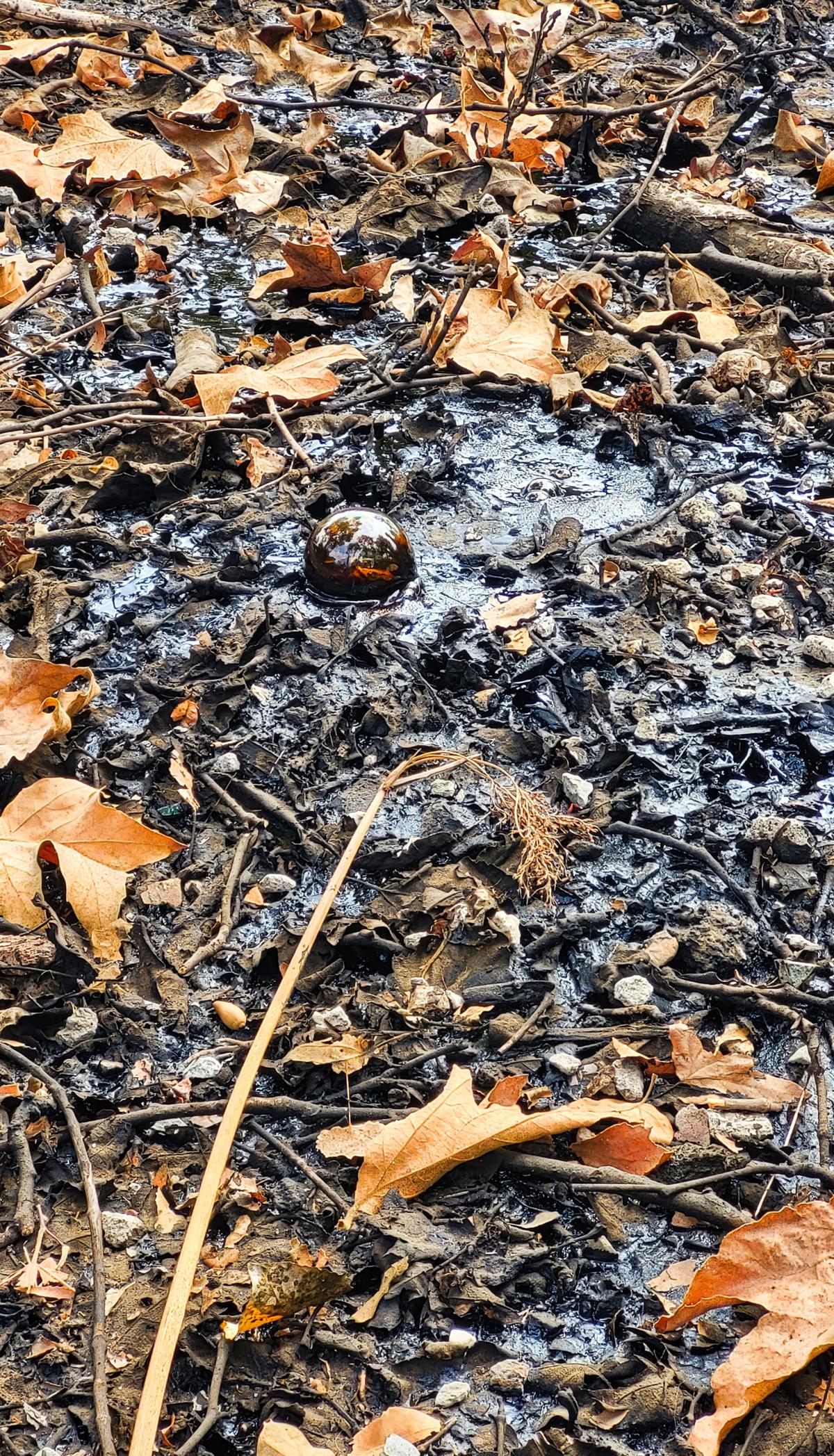 Der Teer kommt natürlich nicht nur in den Absperrungen an die Oberfläche. An einigen Stellen im Park stehen teerverspritzte Verkehrshütchen, die auf Löcher im Gehweg aufmerksam machen.