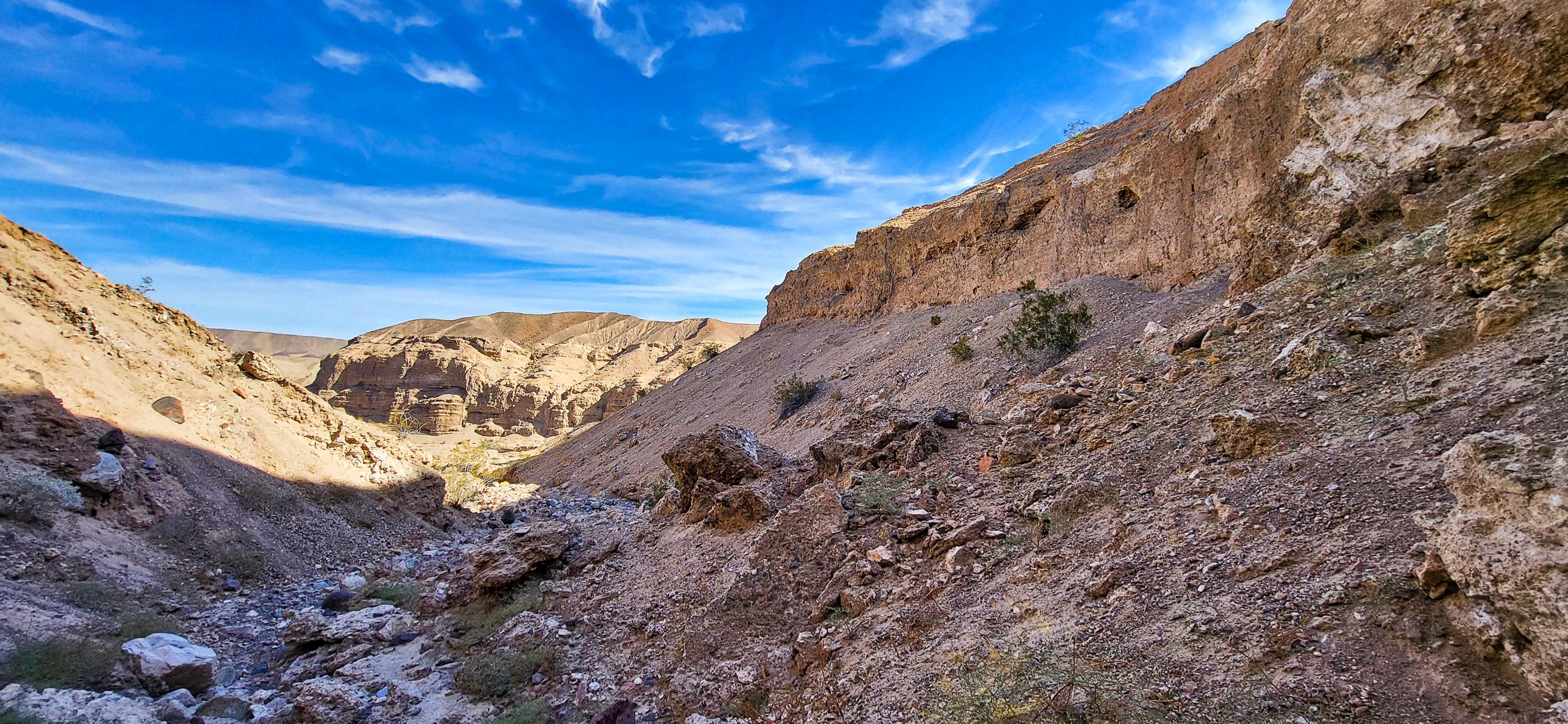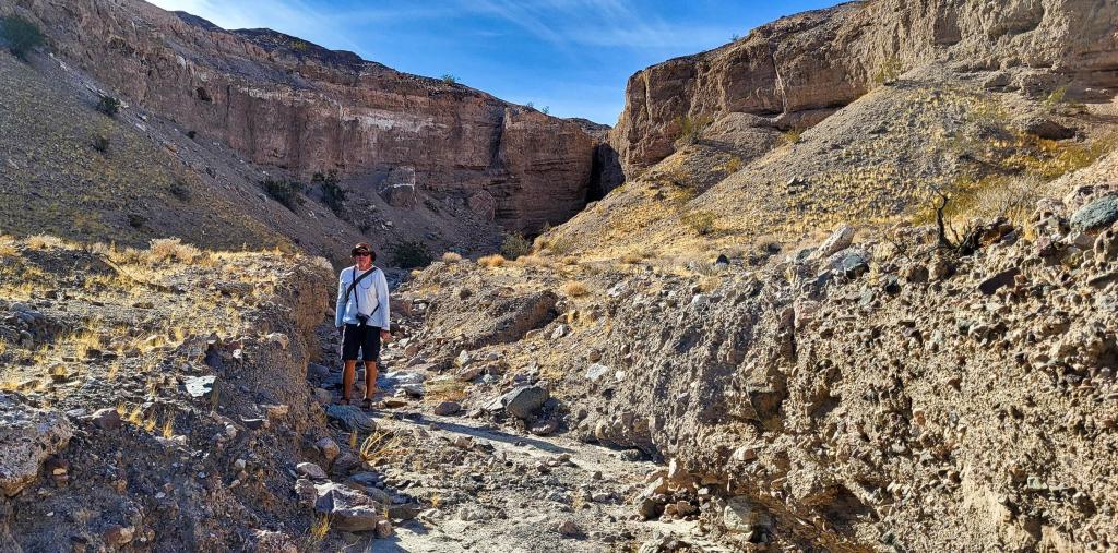 Der letzte Halt vor Vegas. Wir hatten keine Idee, was hier eigentlich los ist. Es gab einen kleinen, schön angelegten und kostenlosen Campingplatz mitten im Nirgendwo. Aber wer würde hier schon Freizeit verbringen wollen? Als Erstes ist uns aufgefallen, dass doch eine ganze Reihe von Leuten morgens in dem trockenen Flussbett unter der Eisenbahnbrücke hindurch in den Canyon marschiert ist und abends mit schwereren Säckchen wiederkam. Es hat sich herausgestellt, dass dies der ideale Platz ist, um Kristalle, Edelsteine und Drusen (Kristalle inmitten eines Steines) zu finden. Natürlich sind wir auch hoffnungsvoll in den Canyon gewandert. Leider sind uns keine Edelsteine begegnet, und das Wissen, wonach man schauen muss, ist bei uns gleich null.