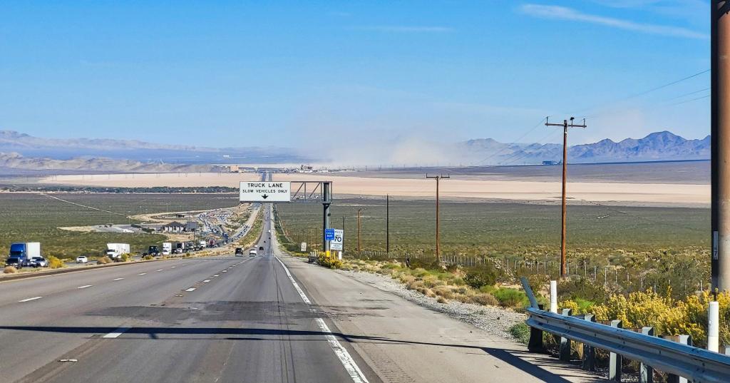 Wir sind auf direktem Weg von Kingman nach Kalifornien aufgebrochen. Witzig ist, dass man tatsächlich eine Art Grenze überquert, wenn man in den Bundesstaat Kalifornien einreist. Es spielt keine Rolle, wer du bist – aber wehe, du hast Gemüse oder Obst dabei!