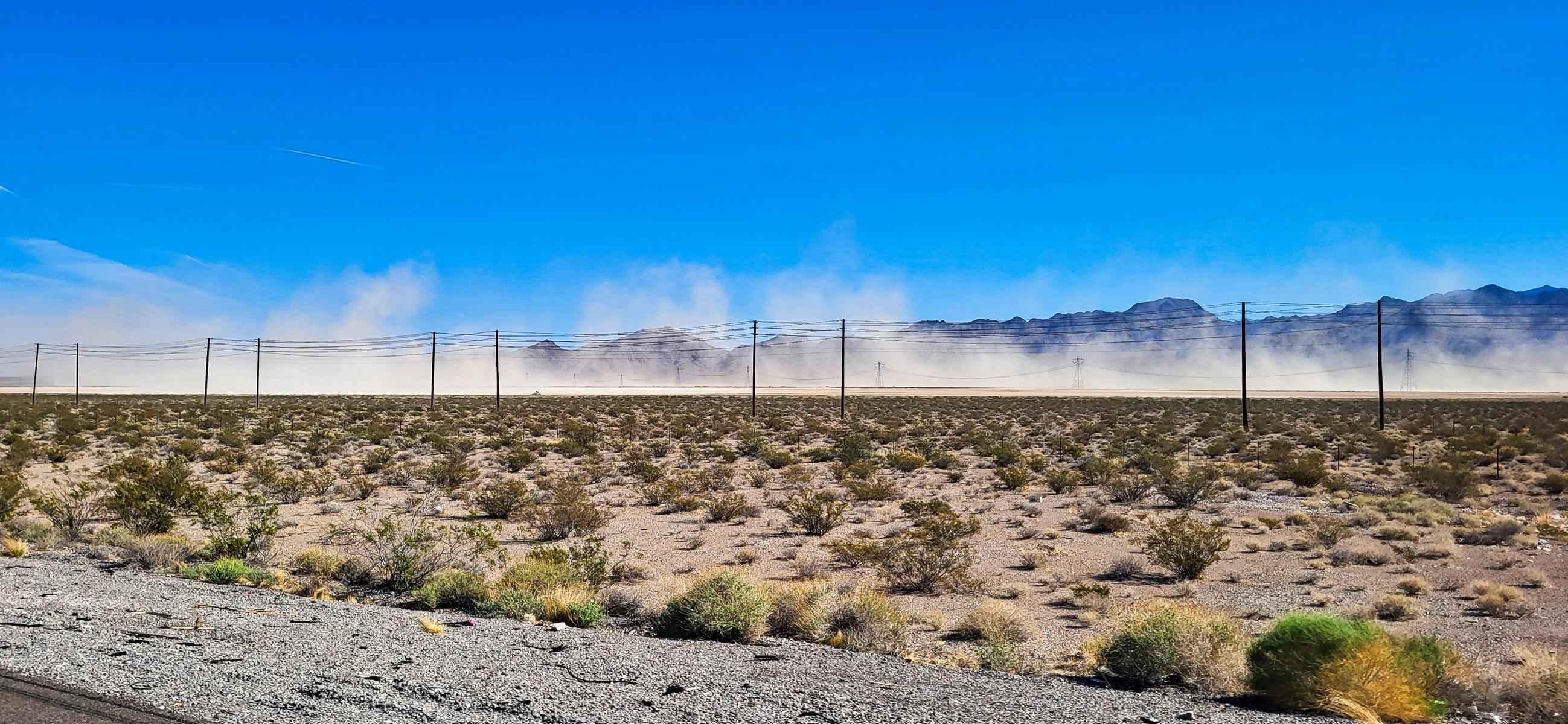 Hier sind ein paar Bilder von unserem Weg in die Stadt der Spieler. Man sieht immer wieder Berge in der Ferne, die auch immer wieder ein Foto wert sind. Kurz vor Las Vegas gab es dann Sandteufel zu bestaunen. Der Wind wirbelte den feinen Sand in vielen kleinen Tornados auf.