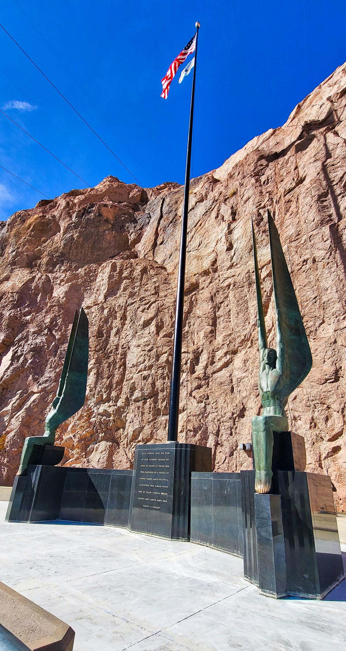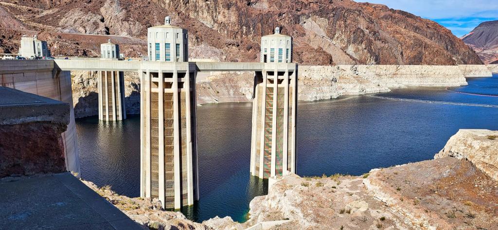 Der Damm staut den Colorado River zu einem riesigen See, Lake Mead. Das Wasser ist so wundervoll blau in der Wüste. Die Straße, die über den Damm führt, beginnt in Nevada und endet in Arizona. Die Wassertürme auf beiden Seiten haben also im Sommer einen Stundenunterschied.