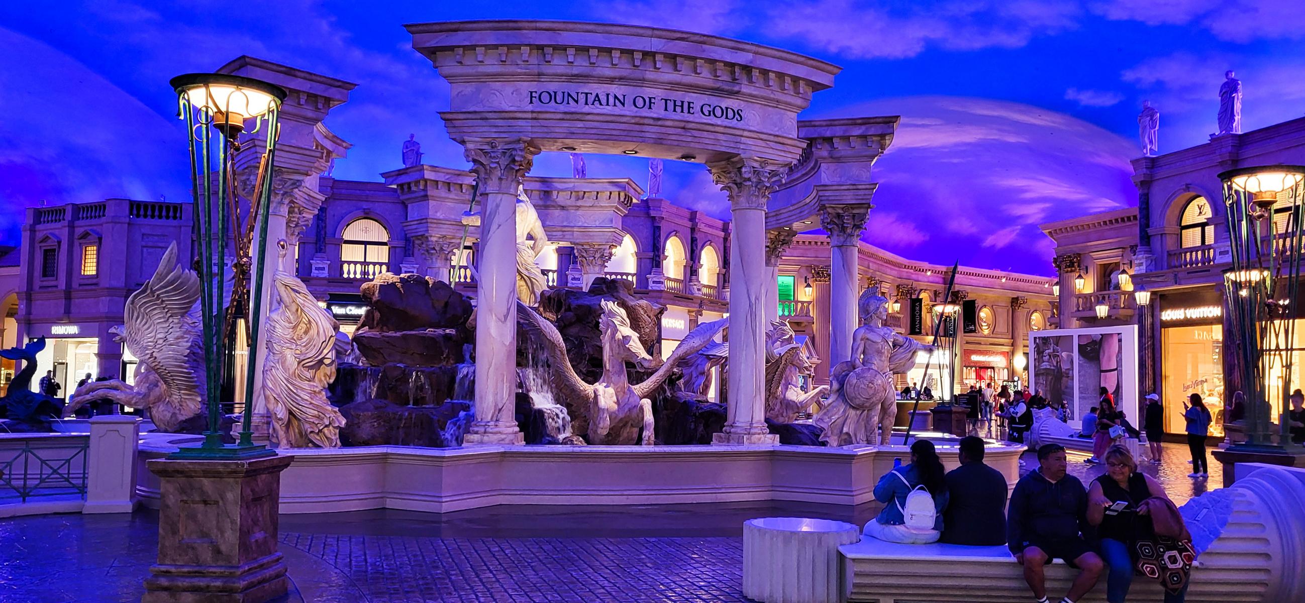 Gleich mit dem Übergang zum Caesars Palace. Hier steigt man in die geheimen römischen Katakomben hinab, um dann am (amerikanisierten) römischen Marktplatz mit Trevi-Brunnen wieder herauszukommen.