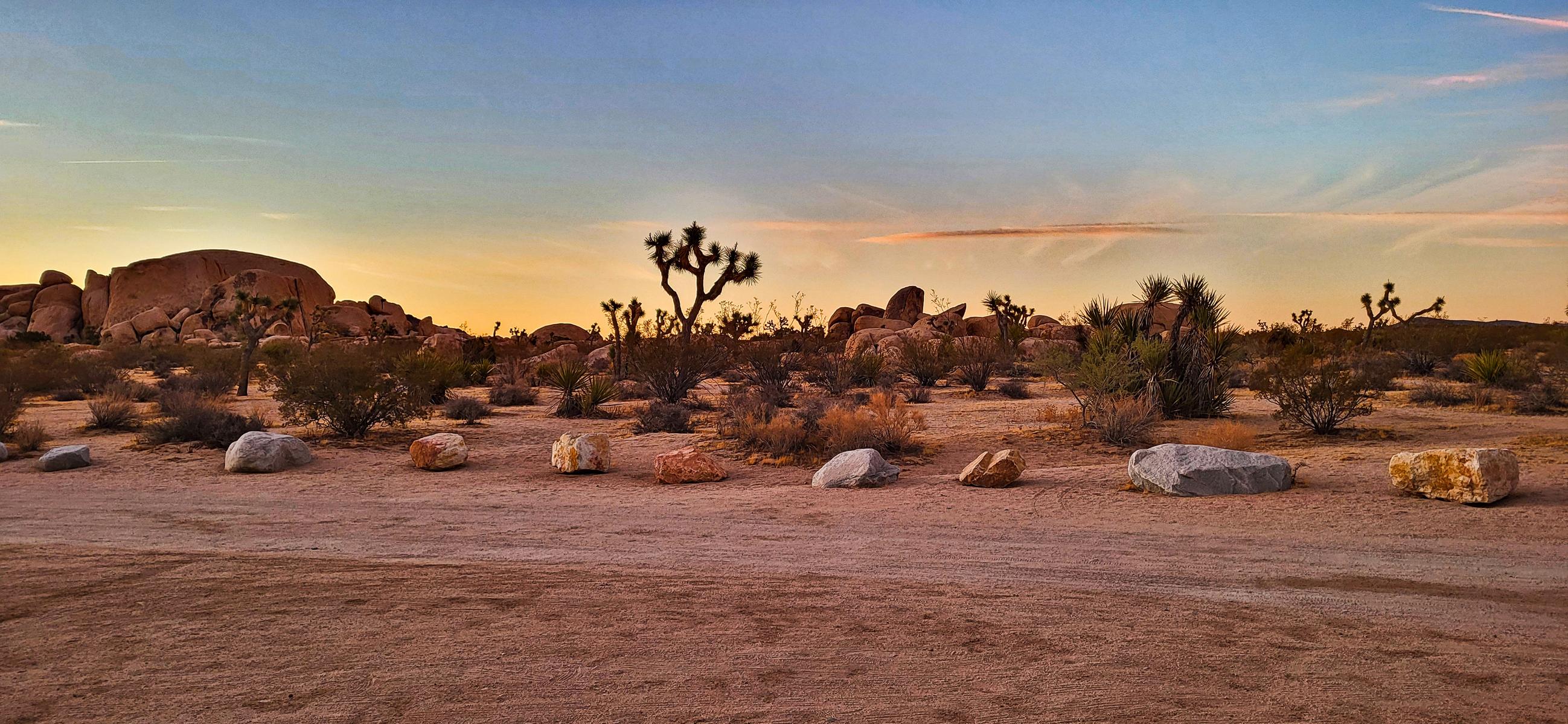 Zum anderen sind wir morgens einen Trail gelaufen, der zu einem Felsen führte, in dem Petroglyphen zu finden sind (mittig ein bisschen links vom Baum). Ich habe noch nie so schöne Sonnenauf- und -untergänge gesehen wie hier im Joshua Tree.
