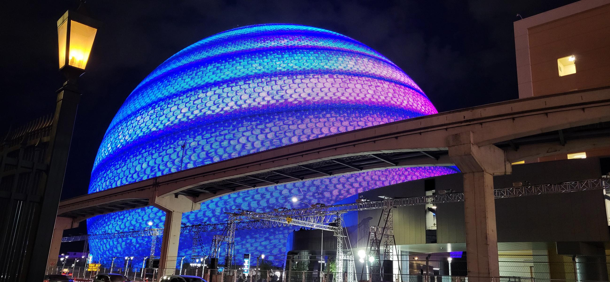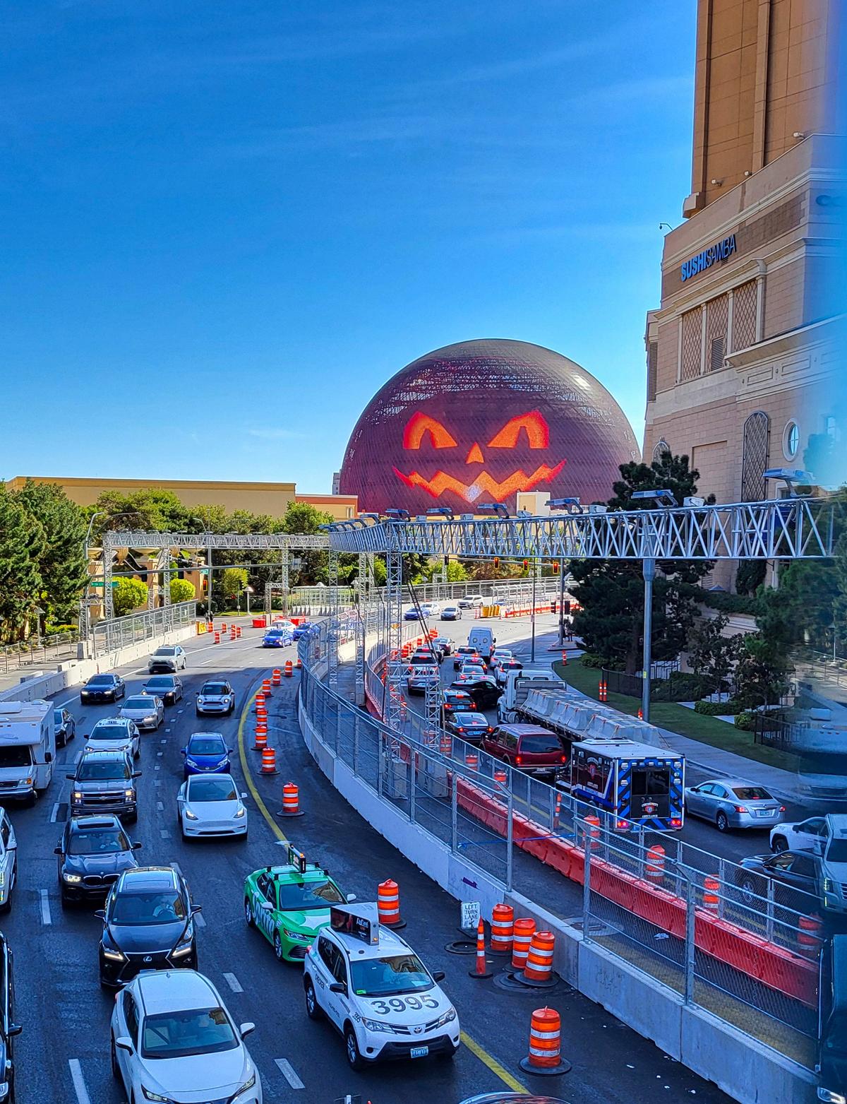 Zu den neueren Attraktionen zählt die Sphere. Das ist eine riesige Veranstaltungshalle mit einem 360-Grad-Kino und Konzertsälen. Der Eintritt für die Filme und Konzerte ist sehr teuer und so gut wie immer ausverkauft. Bemerkenswert ist die Außenhaut der Sphere. Sie ist mal bunt, mal Werbefläche, mal ein lebendig gewordener Halloween-Kürbis oder aber ein Smiley, der einem böse anschaut. Ich hätte Stunden zuschauen können.