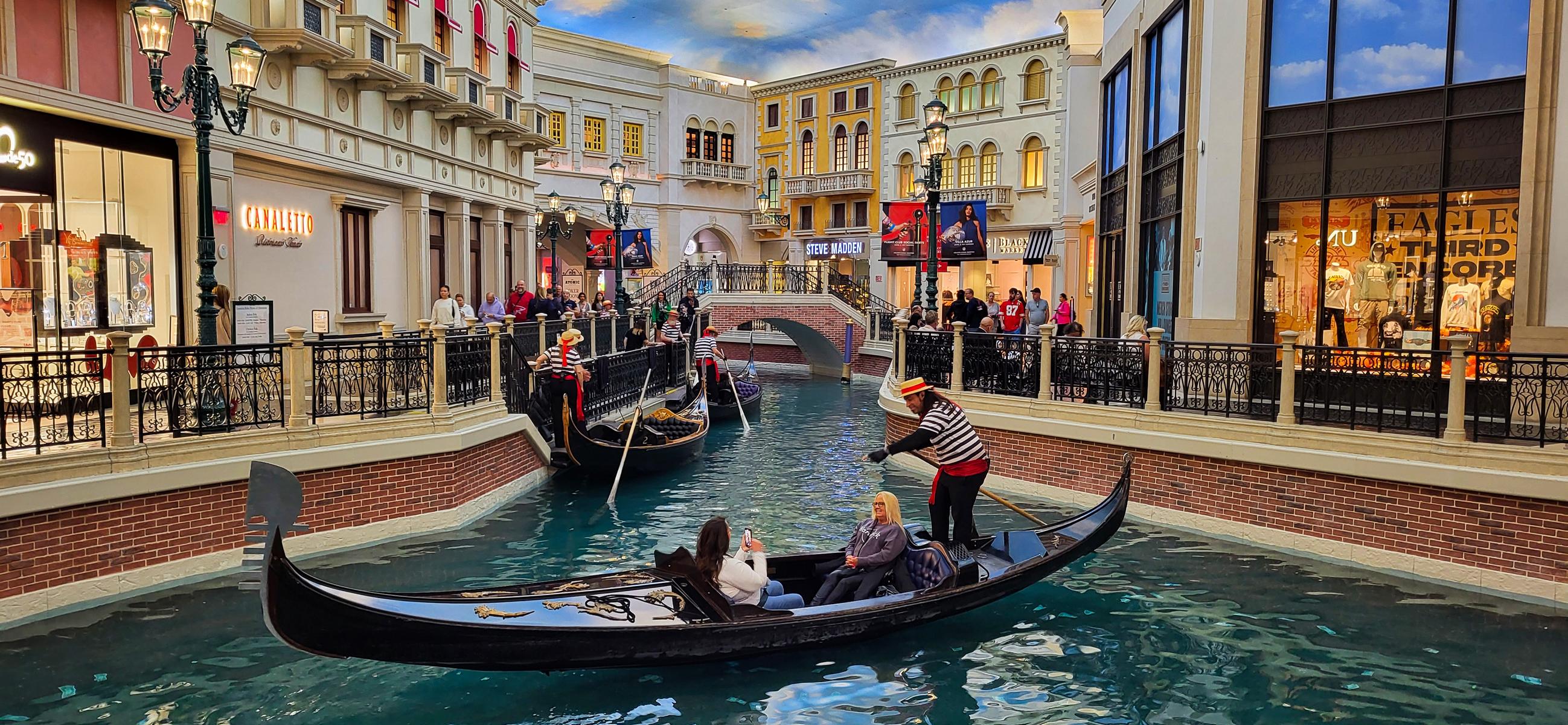Das Venetian ist für mich die absolute Krönung der Illusion. Es ist innen wie außen Venedig in klein, mit den Plätzen, den Restaurants, den engen Gassen und den Kanälen, auf denen man sich von Gondoliere nach innen und außen fahren lassen kann. Wenn gewünscht (und bezahlt), singen die Gondoliere auch italienische Lieder.