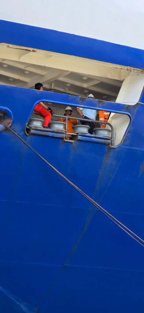 Die Autos wurden mit einem Abschlepptransporter auf die Höhe des Containers gebracht, eingefahren und fest verzurrt. Wie die erwachsenen Männer, nachdem sie die Vorderachse an den Halterungen im Container fixiert hatten, am Auto vorbei wieder hinauskamen, ist mir ein Rätsel – aber es hat geklappt.