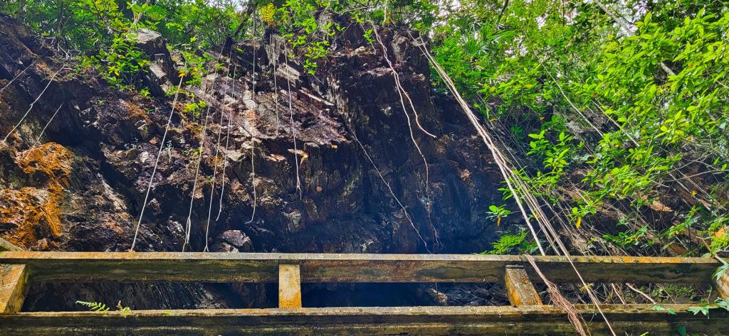 Zum Glück hatten wir uns für die frühe Tour entschieden. Unsere Gruppe bestand nur aus dem Guide und uns, und selbst später in der Höhle waren wir allein. Zum Höhleneingang führte eine kurze Wanderung mit zwei Flussquerungen durch den Dschungel. Dabei erfuhren wir viel über Bäume und Früchte und konnten an den Spuren auf dem Boden sehen, welche Früchte die Brüllaffen am liebsten mochten. Am Höhleneingang hatten wir noch Zeit, uns abzukühlen und eine Runde im klaren Wasser zu schwimmen.