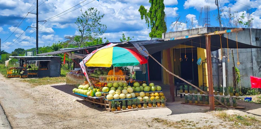 Da wir keine frischen Lebensmittel über die Grenze mitnehmen konnten, mussten wir in der nächsten „größeren“ Stadt einkaufen. Sehr schnell lernten wir, dass es in Belize nur selten Vollsortimenter wie Walmart gibt – und wenn, dann ausschließlich in der Hauptstadt. Die meisten „Supermercados“ führten nur abgepackte Waren. Obst und Gemüse bekam man an Straßenständen oder in kleinen Geschäften (Tiendas).