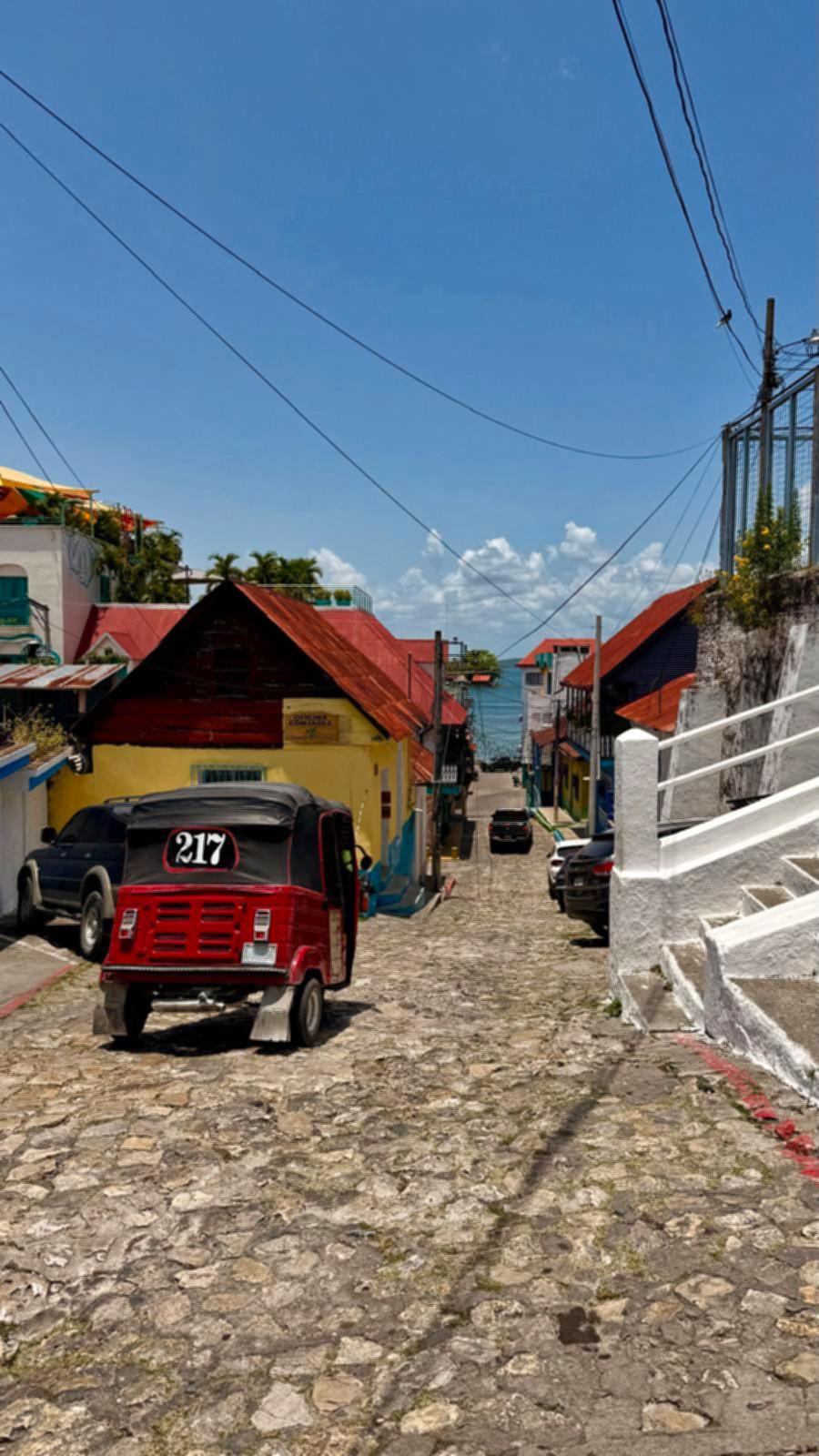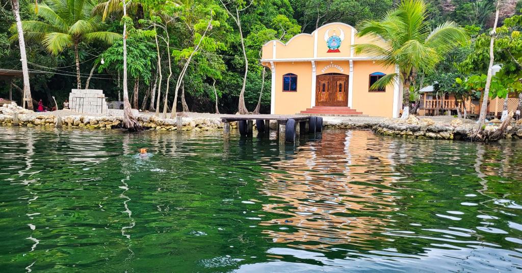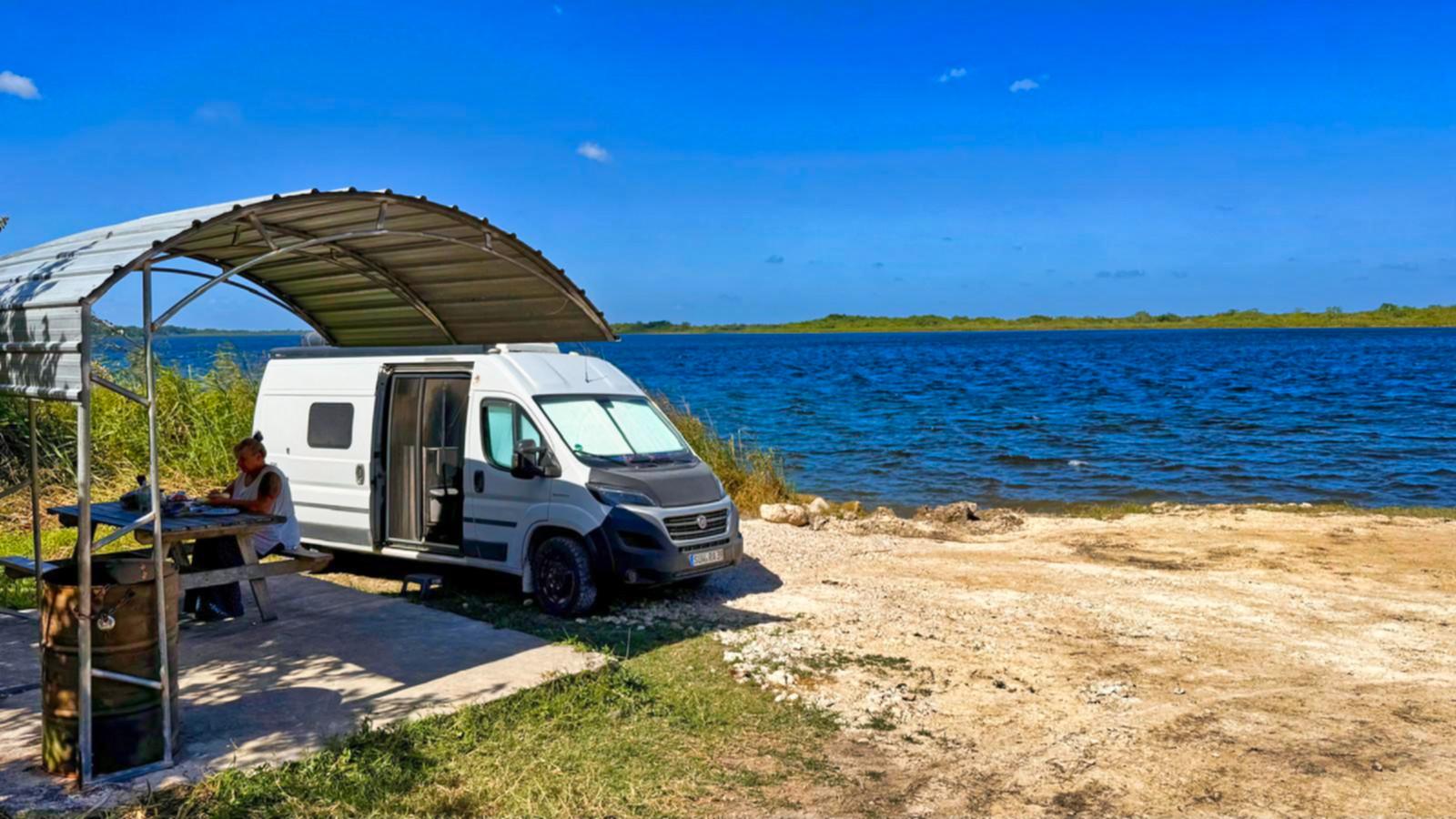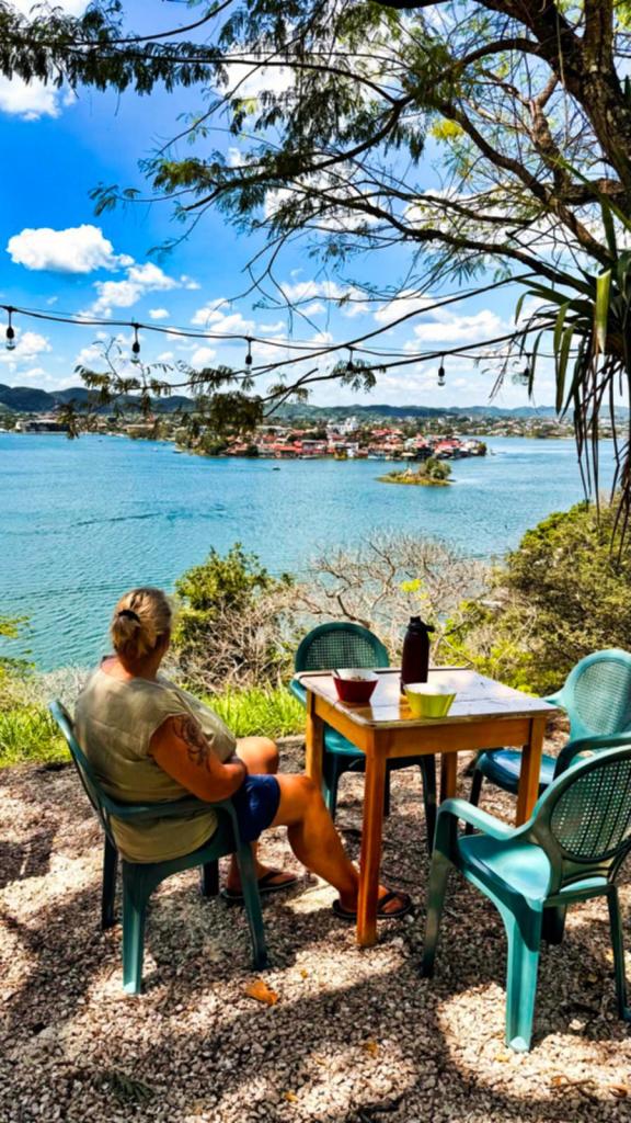 Es war Zeit zum Einkaufen und zur Planung, wie wir unseren Weg durch Zentralamerika fortsetzen wollten. Nächster Halt also: der „Lago de Petén Itzá“ mit der schönen Stadt Flores. Auf dem etwas höher gelegenen gegenüberliegenden Ufer fanden wir einen fantastischen Campingplatz – mit Pool, Aussicht und Panorama. Wenn wir Lust hatten, konnten wir an der Bar kalte Getränke bestellen und abends Burger essen. Das Ehepaar, dem der Campingplatz gehört, war superfreundlich und hilfsbereit. Hier erfuhren wir viel darüber, wie Corona den zart aufblühenden Tourismus in Mittelamerika um Jahre zurückgeworfen hat.