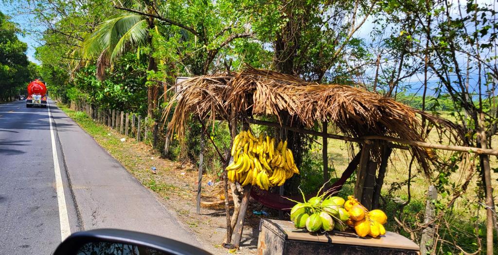 Am Parkplatz gab es einen kleinen Stand, der frisches, geschältes und geschnittenes Obst verkaufte. Normalerweise treiben sich immer Katzen und Hunde um die Essensstände herum, in der Hoffnung, etwas abzubekommen. Selbst beim Obst hatten sich Liebhaber gefunden – für uns ungewöhnlich groß, aber sehr fotogen. Selbstverständlich leisteten wir unseren Obolus.