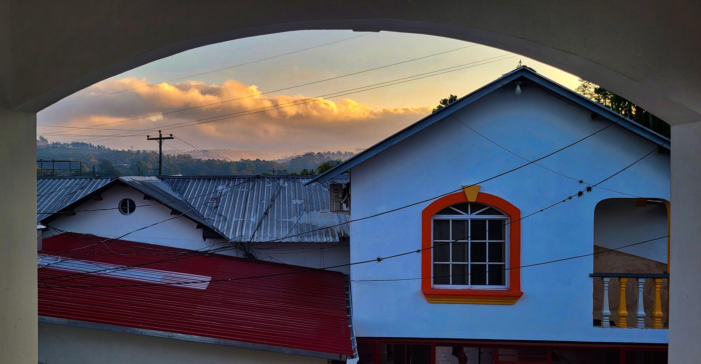 Übernachtet haben wir in einem kleinen Hotel-Restaurant an der Durchgangsstraße. Es gab einen Wachmann, der nachts auf unser Auto aufpasste, da wir zu hoch waren, um in den Hof zu fahren. Am nächsten Morgen begrüßten uns rosa Regenwolken.