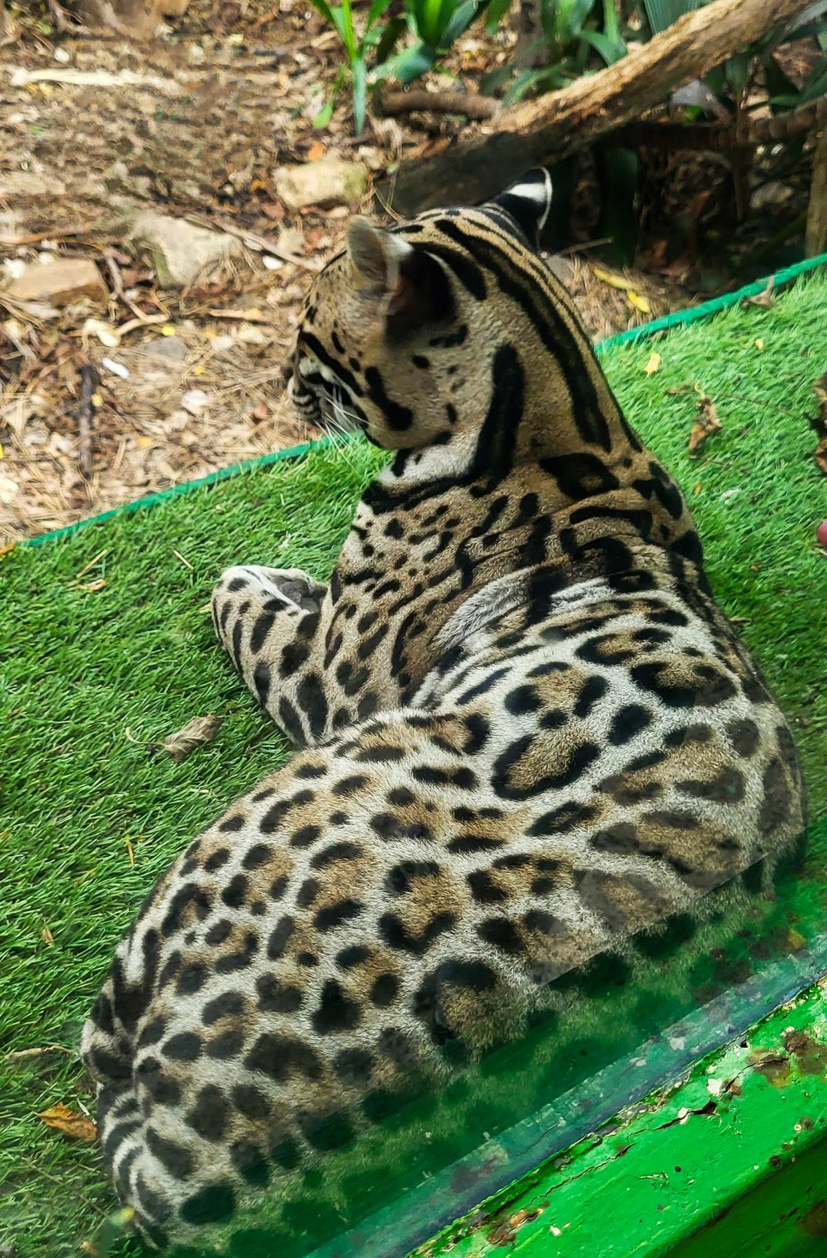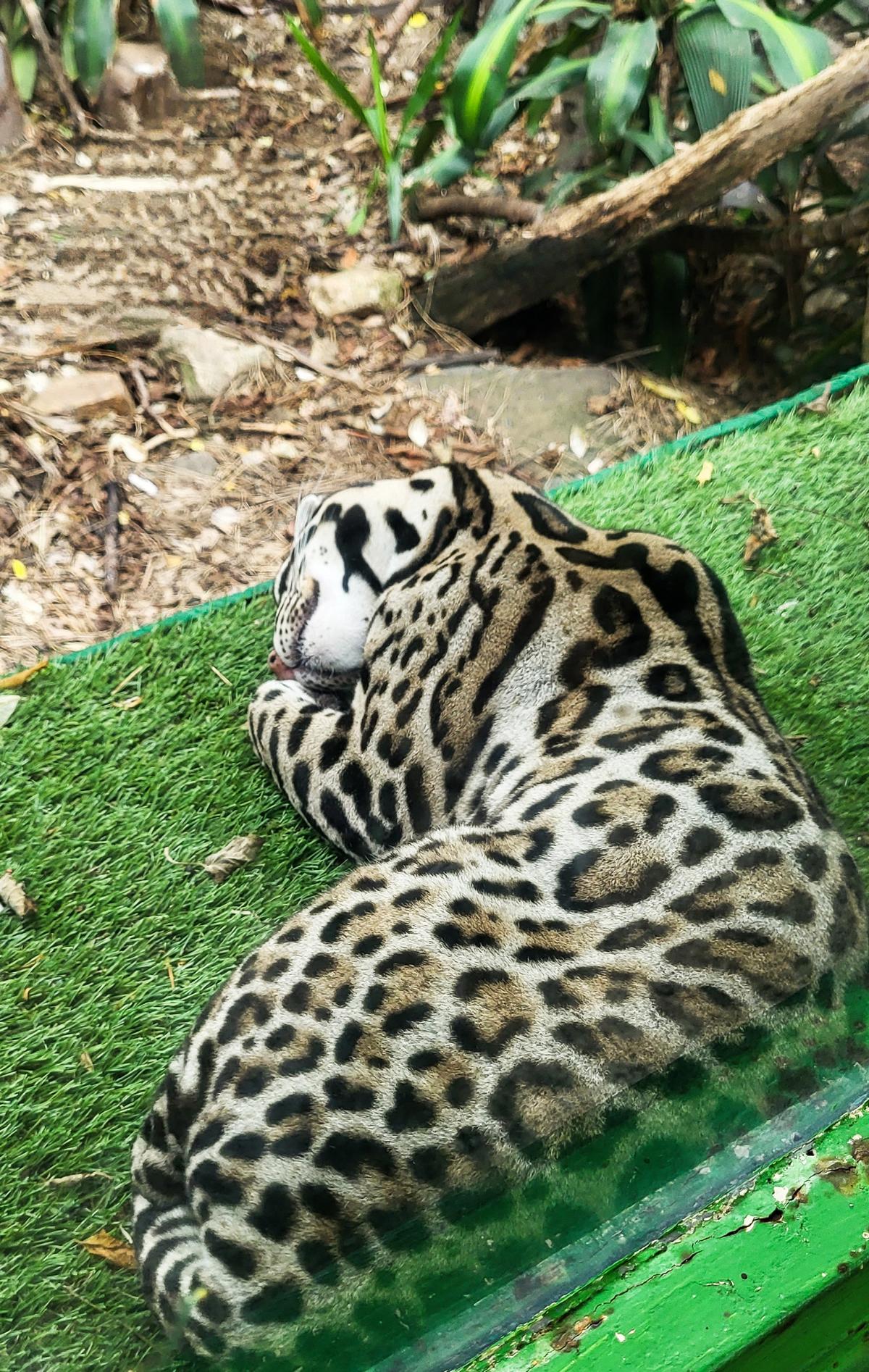 Die beiden Katzen waren übrigens zur Wiederauswilderung bestimmt: ein Ozelot (schlafend und entspannt) und ein kleinerer Berg- oder Baumozelot, der es kaum erwarten konnte. Den Zaun habe ich retuschiert, deshalb ist das Bild etwas unscharf.