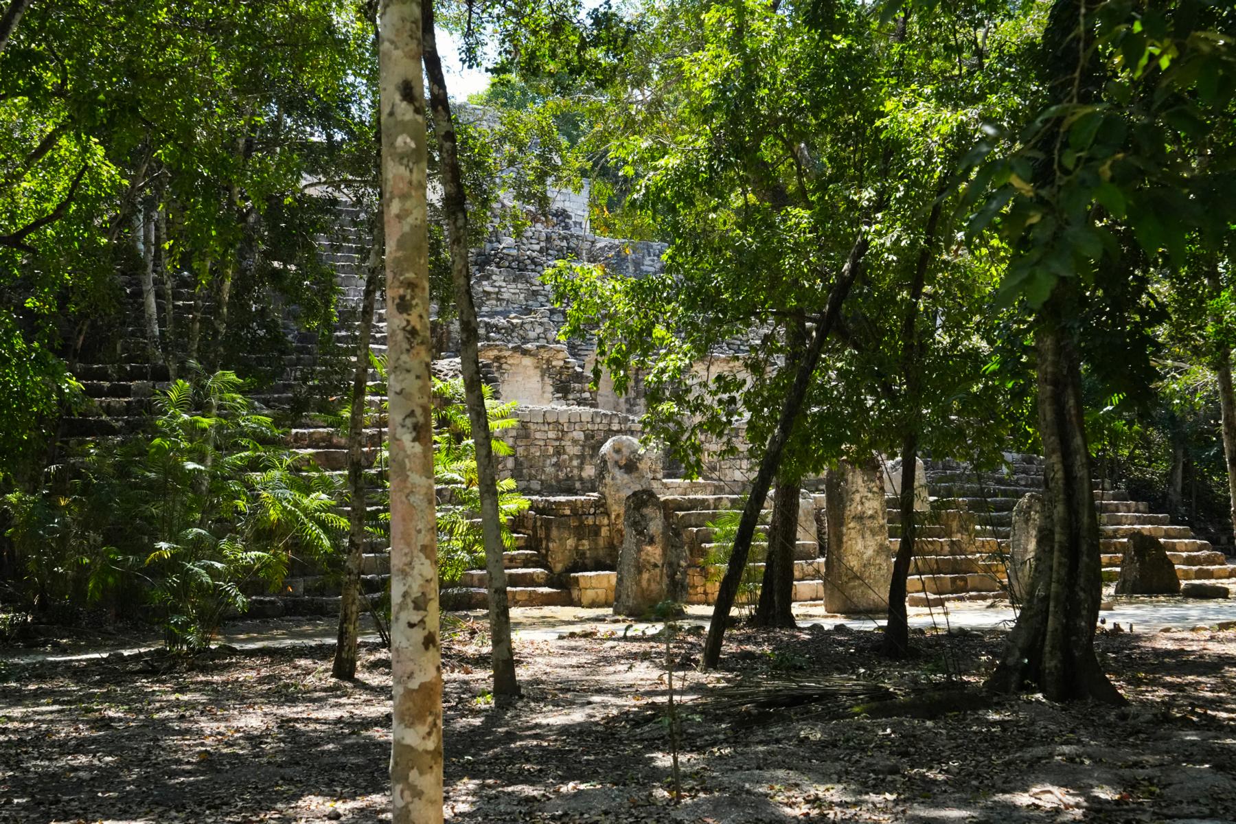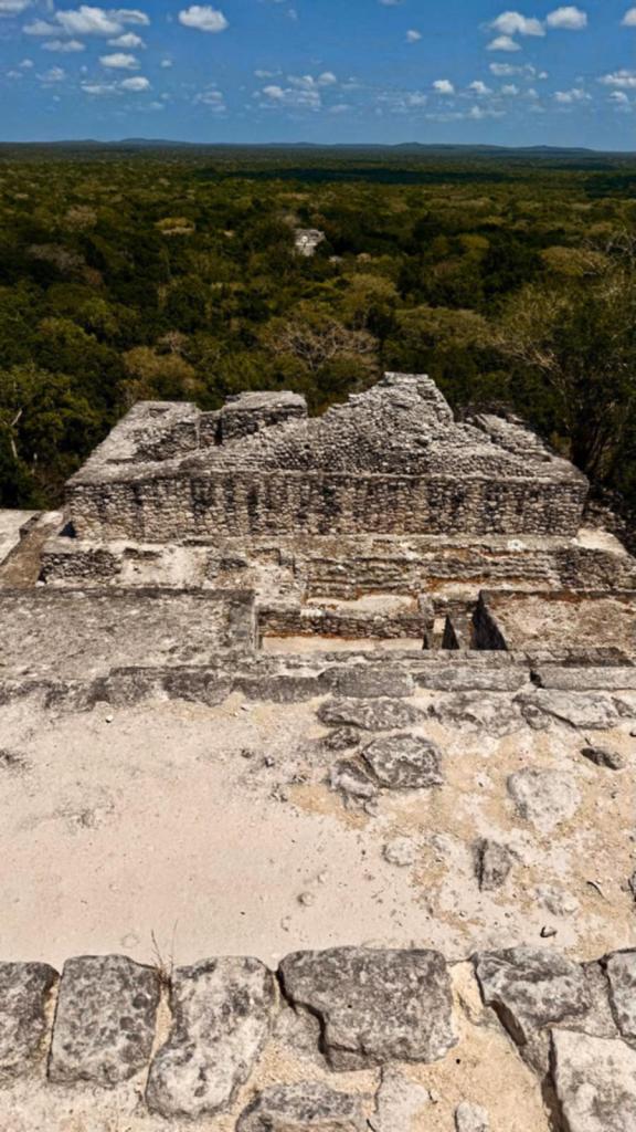 Auf die hohen Pyramiden kann man hinaufsteigen. Nicht über die Treppen an der Front, wie früher die Priester, sondern über Holztreppen, die an den Rückseiten so angebaut wurden, dass sie auf keinem Foto stören. Ich weiß, es sind viele Bilder, aber das Gelände ist riesig. Es umfasst sechs große Pyramiden und insgesamt etwa 33 Gebäudekomplexe. Wir waren den ganzen Tag unterwegs und haben trotzdem nicht alle gesehen. Ich schreibe die ganze Zeit von „Stadt“ – und ja, denkt euch die Bäume weg, dann erkennt ihr es.