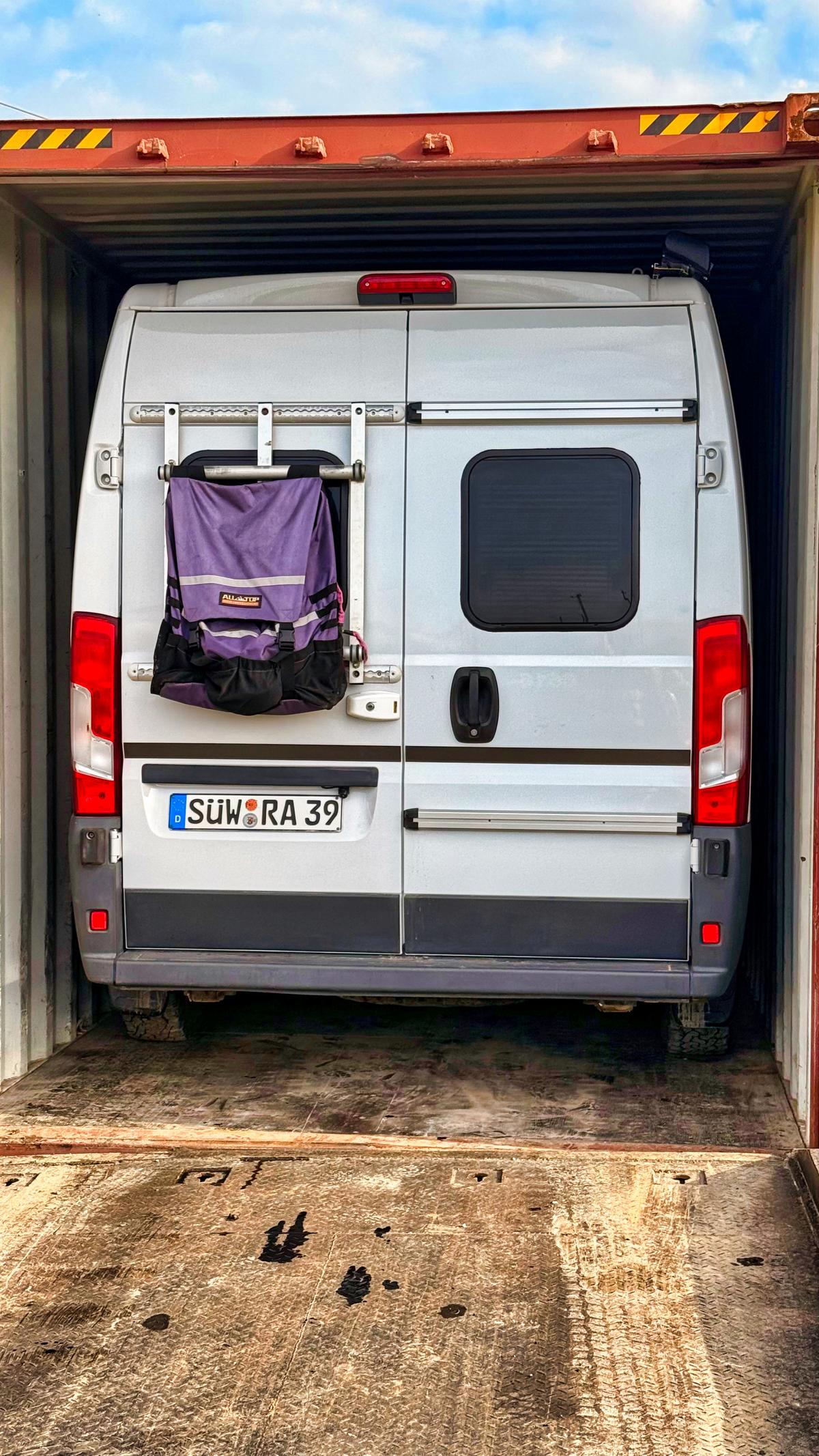 Zu unserem Wunschtermin ließ sich kein Container-Buddy finden. Ja, ich weiß, die Erklärung kommt spät, aber hier passt sie besser. Für unser Auto brauchten wir wegen der Höhe einen großen Container (12 m). Trotzdem mussten wir den Dachlukenventilator abschrauben und das Loch mit einem Stück Plastik und Duct-Tape abdichten. Das Auto ist nur sechs Meter lang, sodass noch ein zweiter Wagen mit in den Container passte. Ein Auto mit Dachzelt oder ein kleiner Van gehen problemlos mit hinein. Teilt man sich den Container, teilt man sich eben auch die Kosten – ein klarer Vorteil für beide Seiten.
