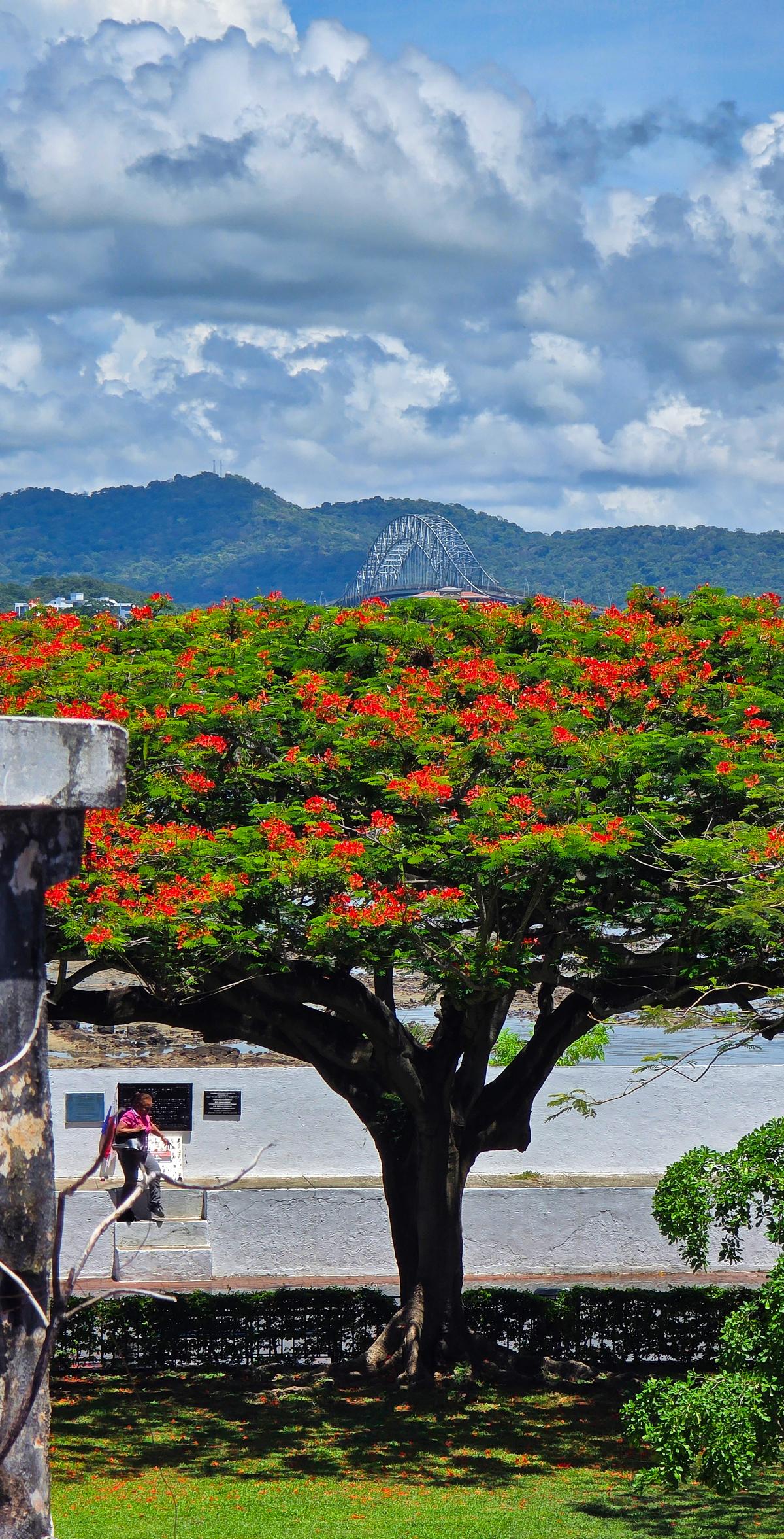 Im Hintergrund des blühenden Baumes sieht man die elegant geschwungene Brücke „Puente de las Américas“ über den Panamakanal.